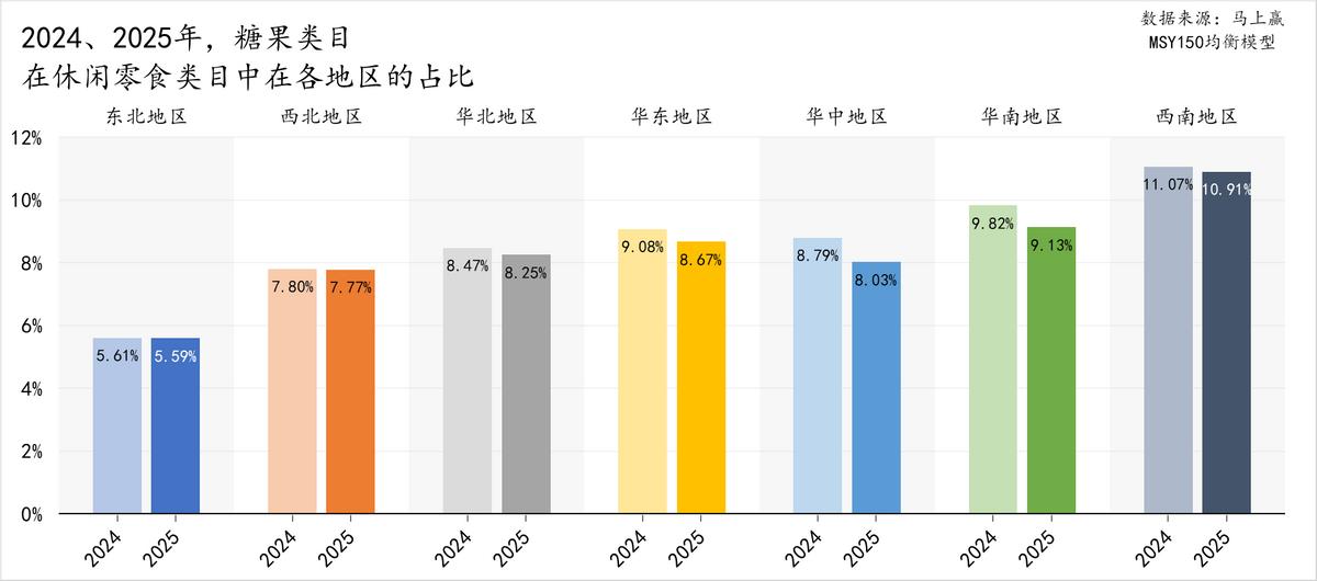 对糖果类目来说,2025年同比2024年,七个地区在休闲零食中的占比均有下滑。其中,西南地区为占比最高的地区,2024年、2025年类目在休闲零食的占比均超10%,东北地区则为占比最低的地区,仅5.5%左右。