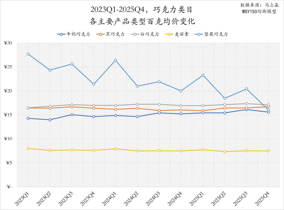 从几个主要产品类型的每百克均价来看,坚果巧克力期内波动最大,其每百克均价整体呈现下降趋势,从2023Q1-2025Q4每百克均价累计下跌超10元,这一显著的价格下行,或与坚果本身,尤其是巧克力常搭配的巴旦木、夏威夷果等树坚果的价格下降有一定相关性;黑巧克力、白巧克力的每百克均价整体接近且较为稳定,在16元左右,白巧克力略高于黑巧克力;牛奶巧克力的每百克均价略低于黑巧与白巧,在15元附件波动,自2024Q3一直超过15元,整体略有上升趋势;麦丽素的每百克均价最低,在8元上下浮动,整体较为稳定。