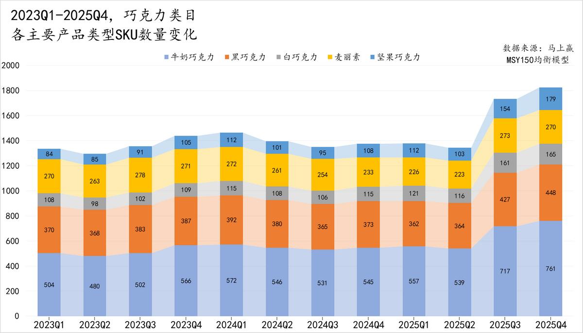 分类型来看,牛奶巧克力期内产品数量增加了257个,其产品SKU数量和增幅始终保持优势,SKU数量在2023Q4上涨超10%,2025Q3单季度环比上涨超30%;黑巧克力期内产品数量增加了78个,2025Q3增长最猛,产品数量首次突破400个;白巧克力期内产品数量增加了63个,其中2025Q3单季度环比上涨了39%;坚果巧克力期内产品数量增加了95个,是观察类型中唯一SKU数量翻倍的产品类型,其中2025Q3单季度环比上涨了49%。麦丽素是唯一SKU数量期内不变的产品类型,从2024Q1开始连续5个季度SKU缩减,直至2025Q3产品SKU增加了55个,SKU数量和占比的趋势或可说明类型产品整体也在逐渐退行当中。