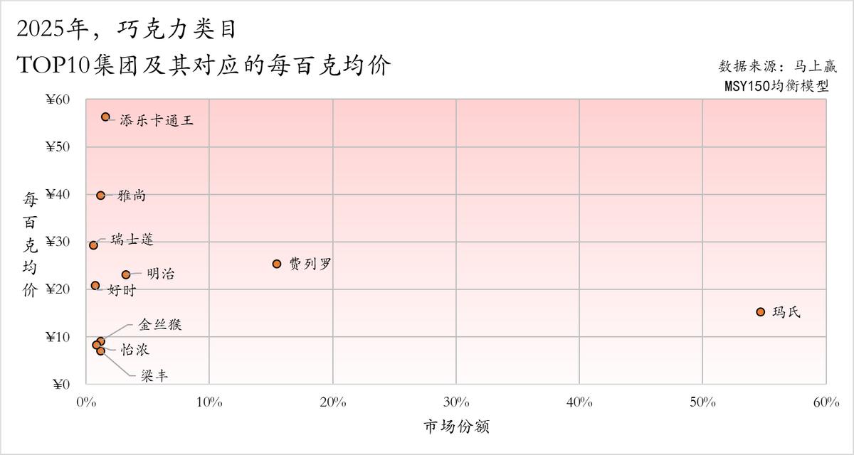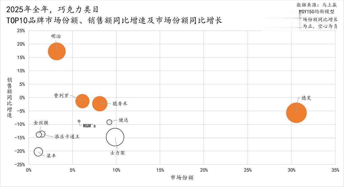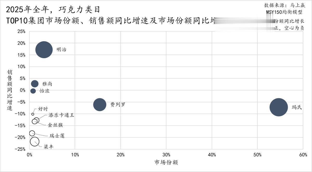 从2025年巧克力类目的TOP10集团来看,明治集团是2025年巧克力类目中销售额同比增速最为显著的集团,同比增速超过15%,市场份额同比也取得了较大的增长;市场份额排名第一占据份额过半的玛氏,市场份额同样同比有增长,排名第二的费列罗市场份额同比增长也为正,头部集团市场份额的进一步增长,或可说明类目集中度未来或还将进一步提升。