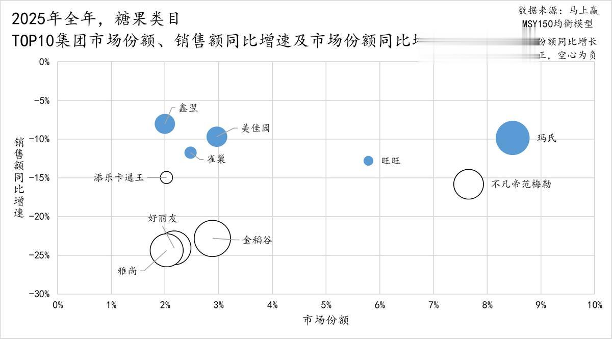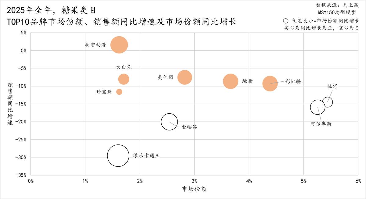 从2025年糖果类目的TOP10集团来看,所有TOP10集团销售额同比均为负,从-5%到-25%不等,体现了类目整体面临的压力。