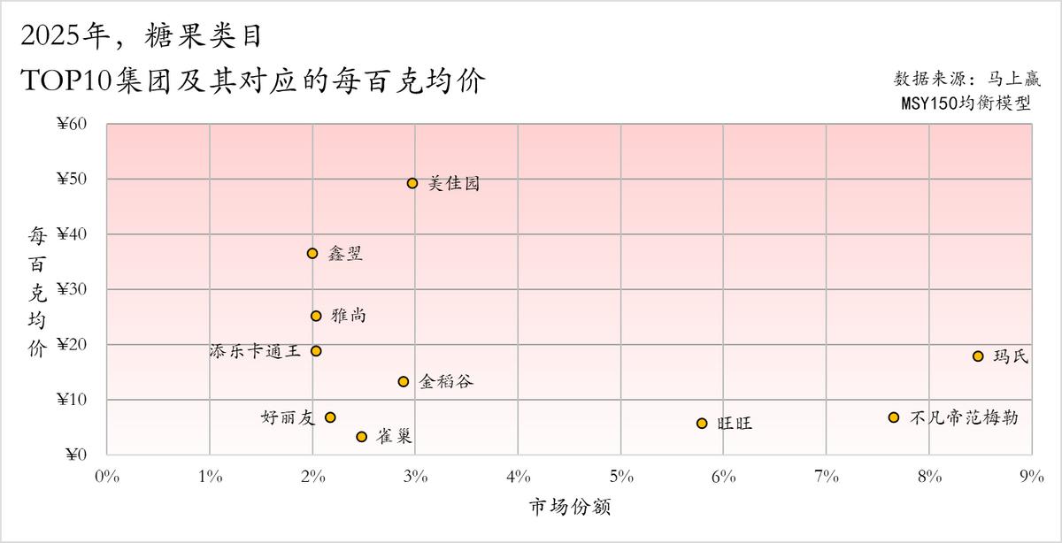 2025年糖果类目市场份额同比取得正增长的集团还有主打IP食玩的美佳园、鑫翌,和一年前收购徐福记的雀巢;而主打IP食玩的雅尚、金稻谷,和主打软糖的好丽友则在销售额同比、市场份额同比都面临较大压力。