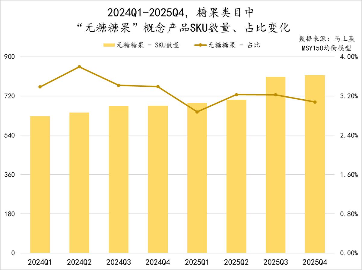 从2024Q1-2025Q4,无糖糖果概念产品SKU数量不断提升,从600+增加至800+,在2025Q3取得了较大增加,然而其占比在2024Q2取得峰值以后,逐渐下降,一度跌破3%,近两年以来,不论是概念产品的占比,还是SKU数量,均未见很明显的快速上升。