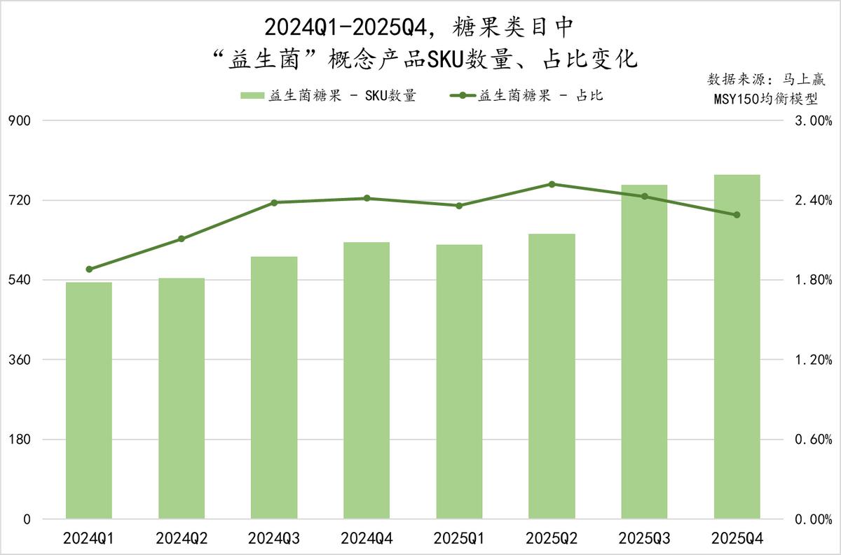 基于马上赢对于上述概念为整体的统计,整个大益生菌概念产品,从2024Q1到2025Q4数量整体呈现显著的上升趋势,从2024Q1的500+个提升至2025Q4的750+个;其类目占比则呈现先升后降的趋势,2024Q1-2025Q2整体上升,2025Q3-2025Q4则呈现下降的趋势。