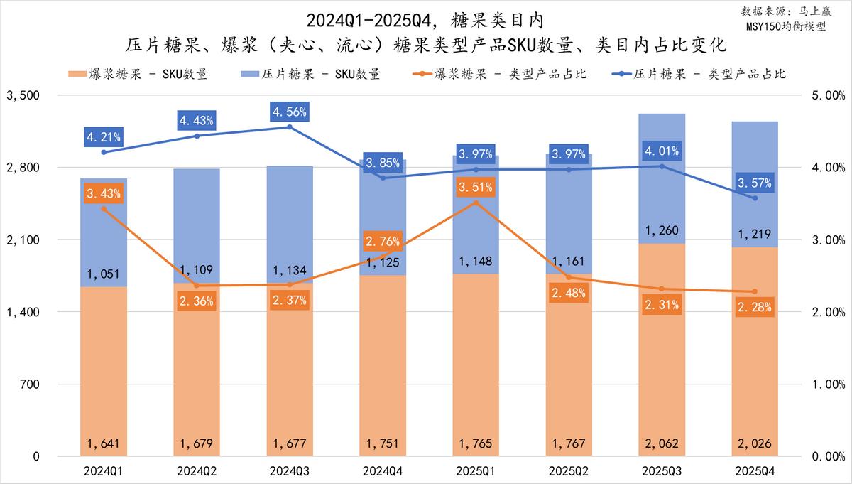分类型来看各个产品类型的SKU数量、类目内占比变化。爆浆糖果类型产品的SKU数量整体明显上升,峰值2025Q3达到2062个,相较2024Q1增加了400多个;类目占比则呈现明显的季节性波动,Q1达3.5%左右,其他时间则在2.5%以下;压片糖果类型产品的SKU数量整体呈现上升趋势,峰值为2025Q3的1260个,但其产品占比整体出现下降,期内两年的Q3-Q4时段占比下降较为严重。