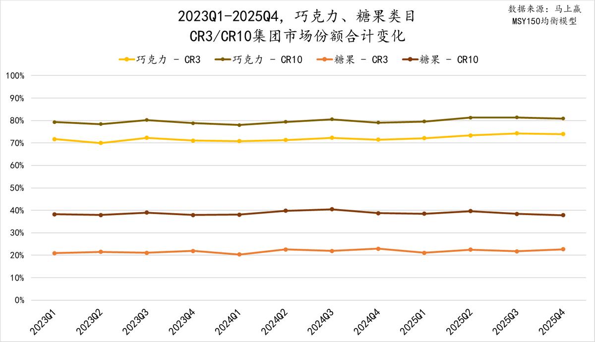 从过去三年CR3/CR10集团市场份额合计变化来看,巧克力和糖果类目存在明显差异。巧克力CR3集团市场份额基本保持在70%以上,市场集中度较高,且2025年CR3市场份额合计还有进一步增加的趋势,集中度进一步提高,CR10集团市场份额则在观察期内稳定在80%左右。