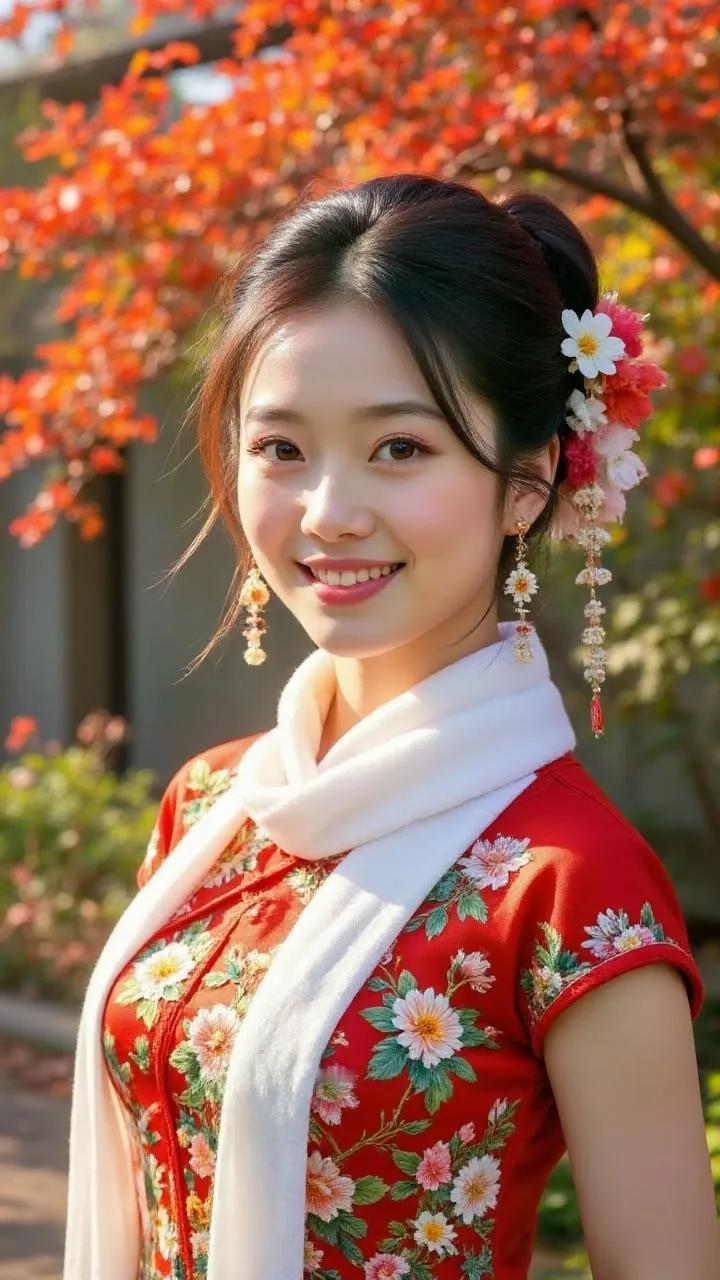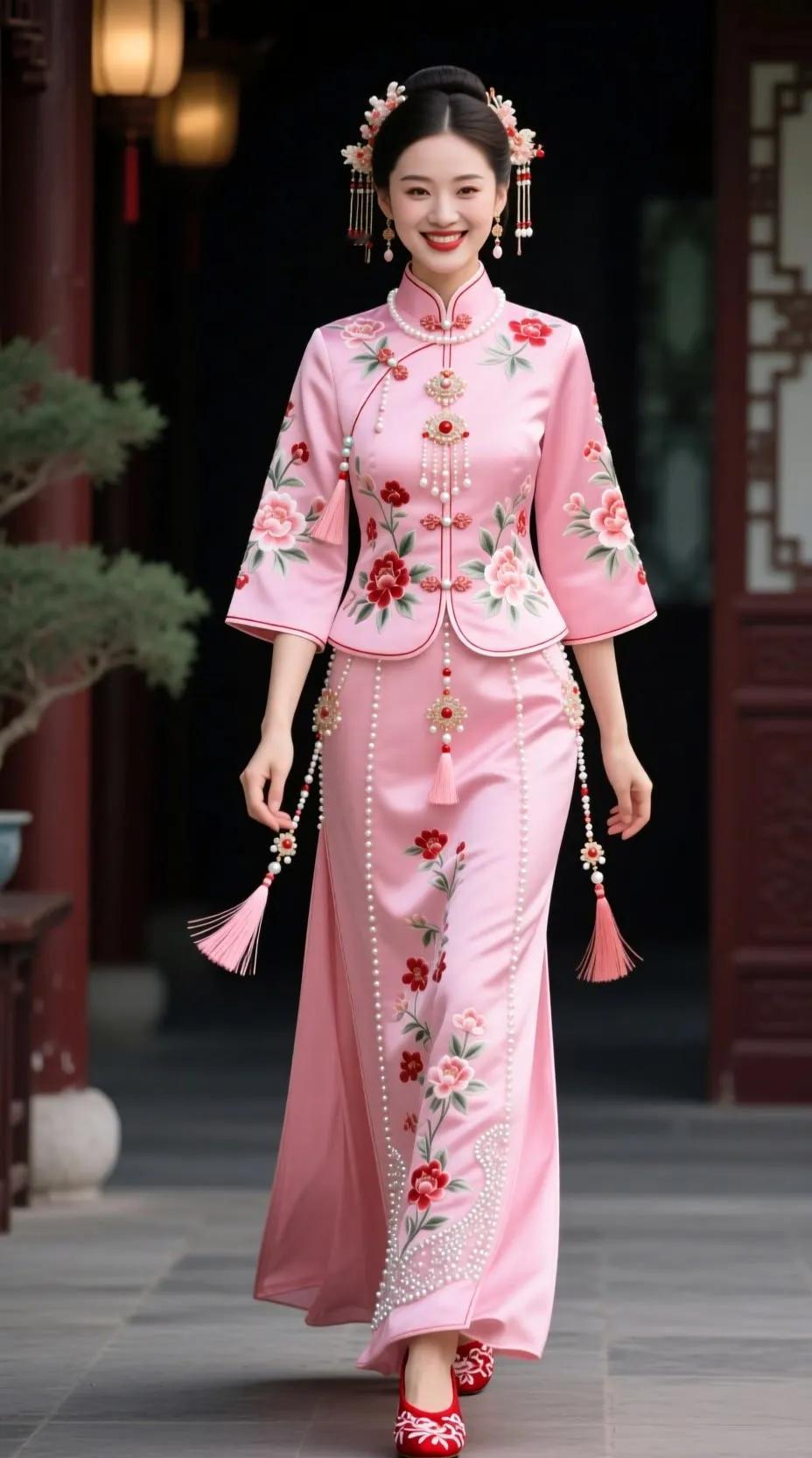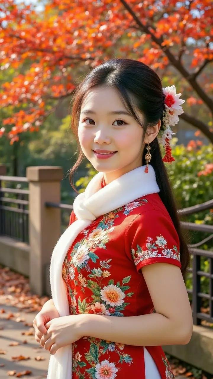 红白相间的旗袍,搭配精致的盘发和花饰,尽显东方古典美!
