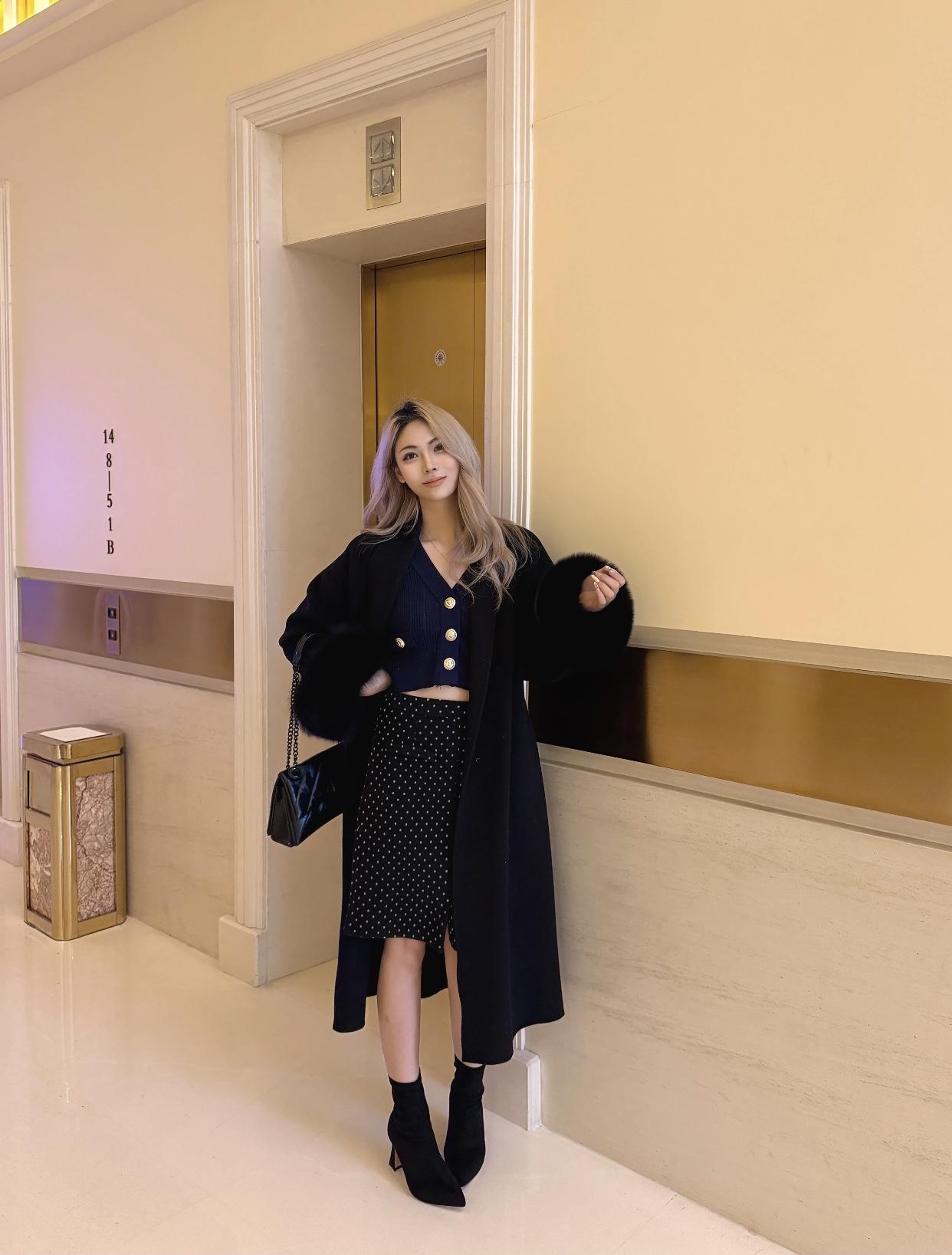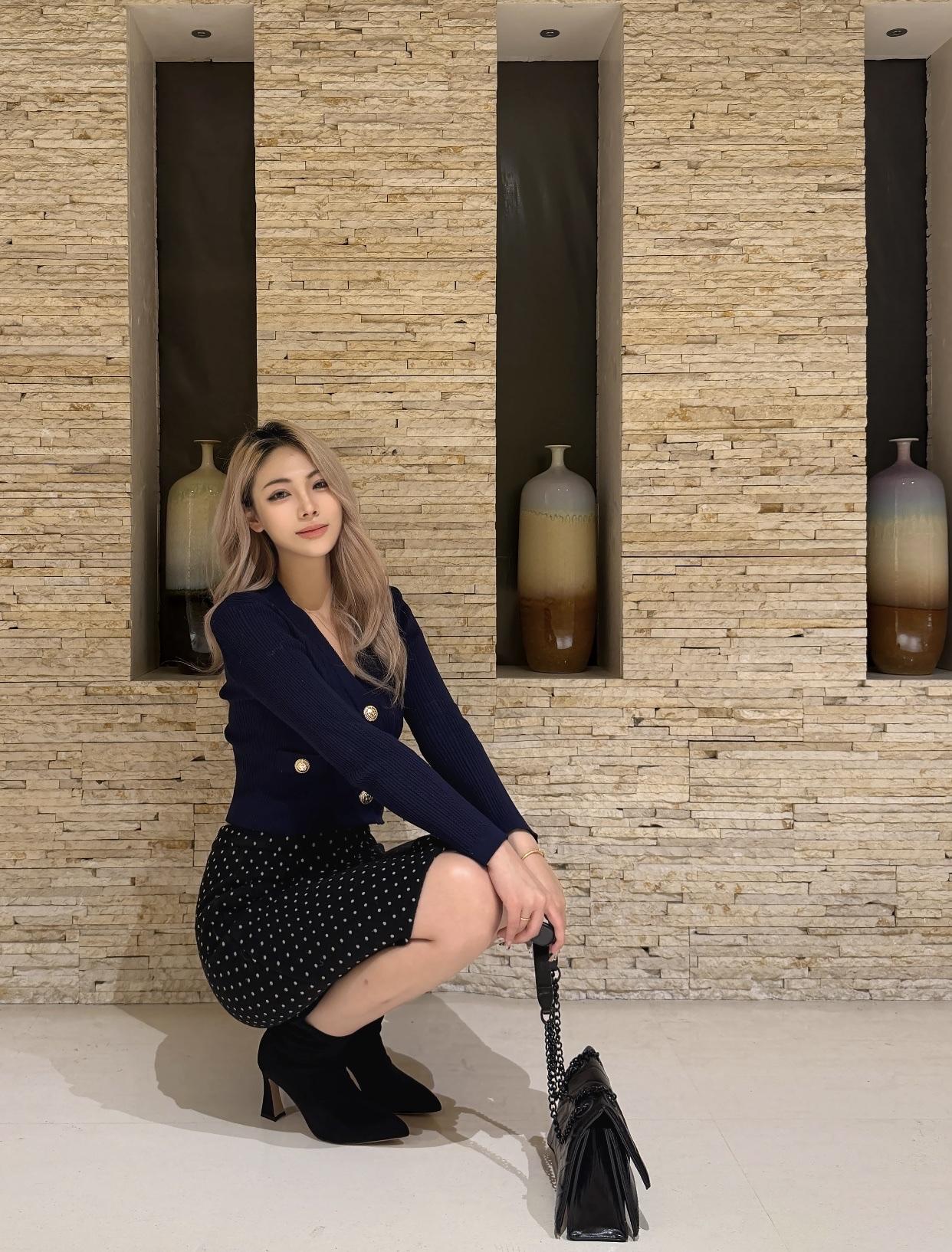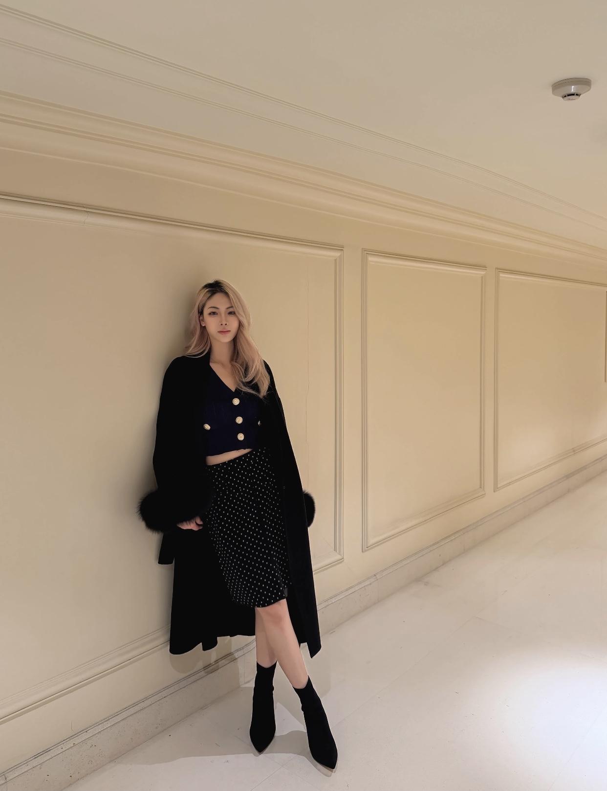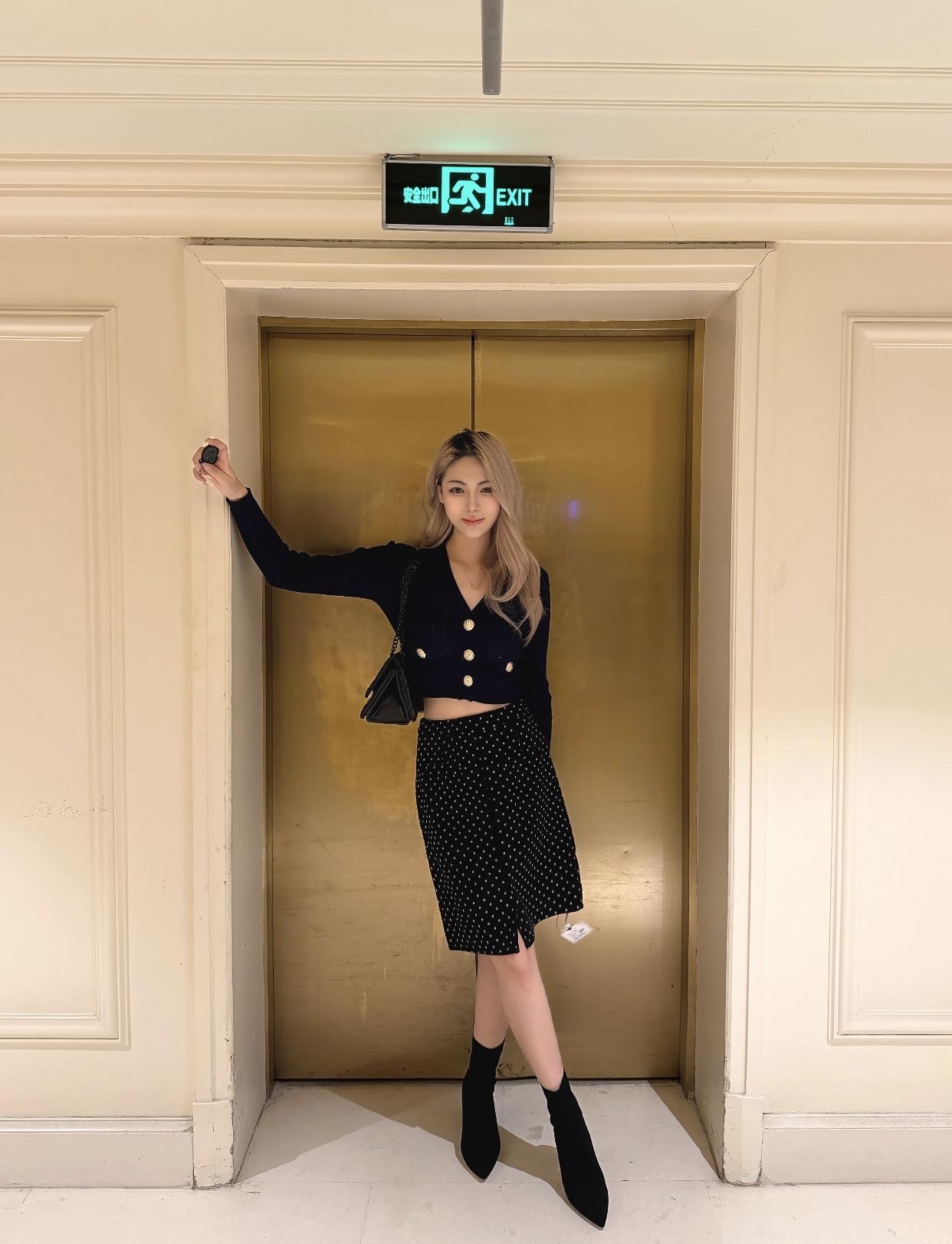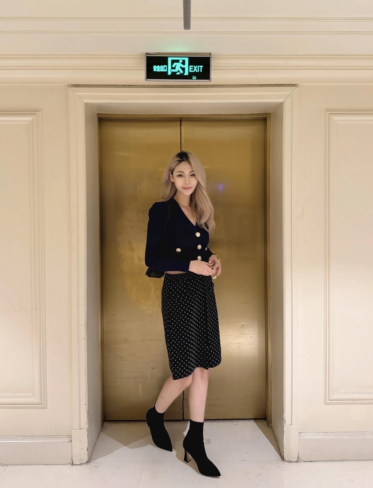 优雅通勤风,黑色毛衣搭配灰色短裙,高跟鞋点缀,时尚又干练!