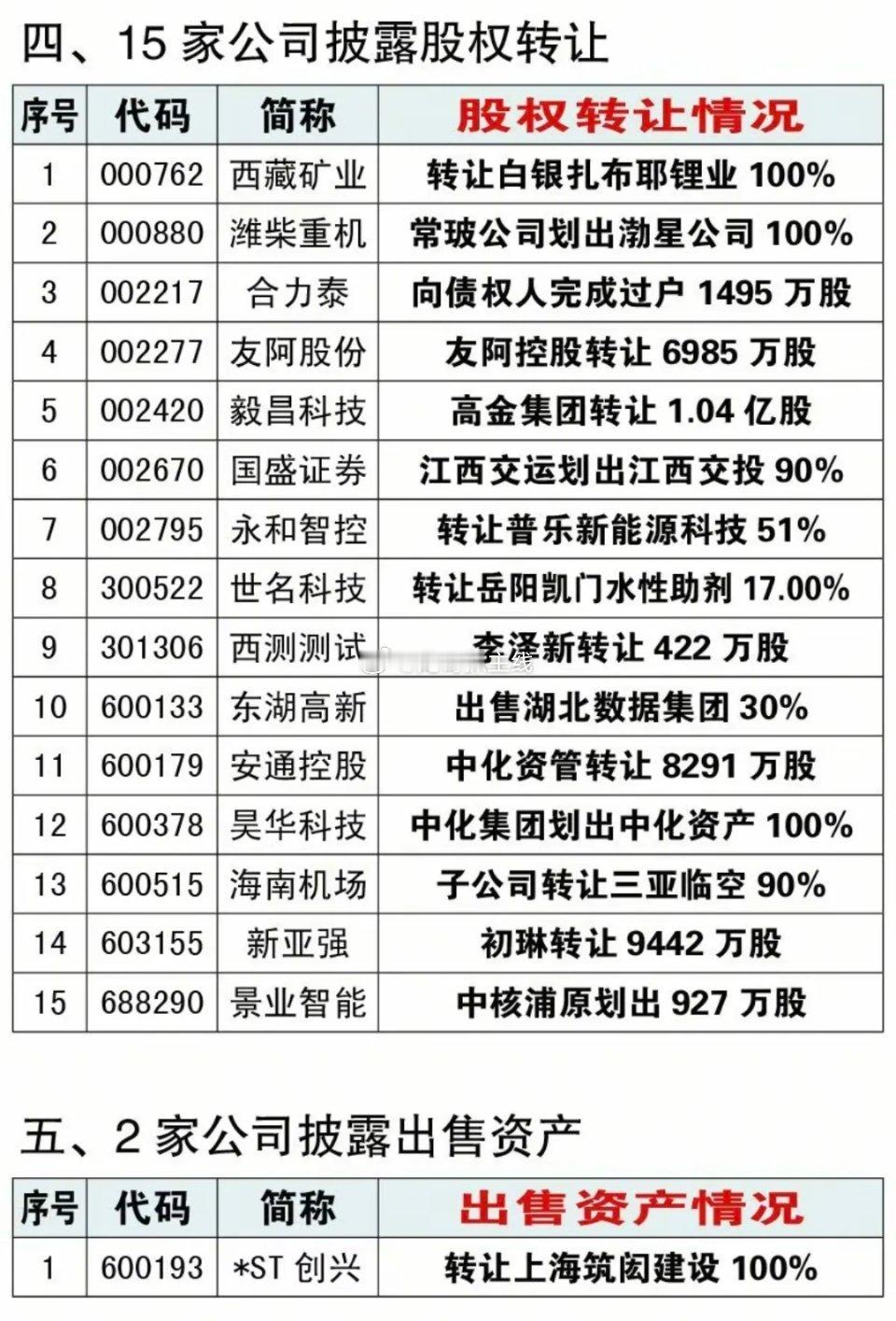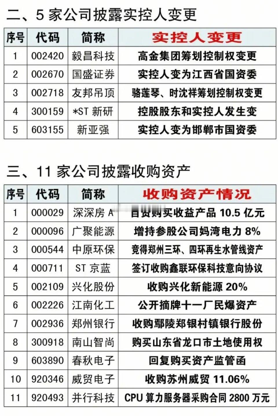 12.26周五 最新:资产重组、实控人变更、股权转让公告!12家公司资产重组,2家出售资产,15家股权转让,5家公司实控人变更,11家披露收购资产。