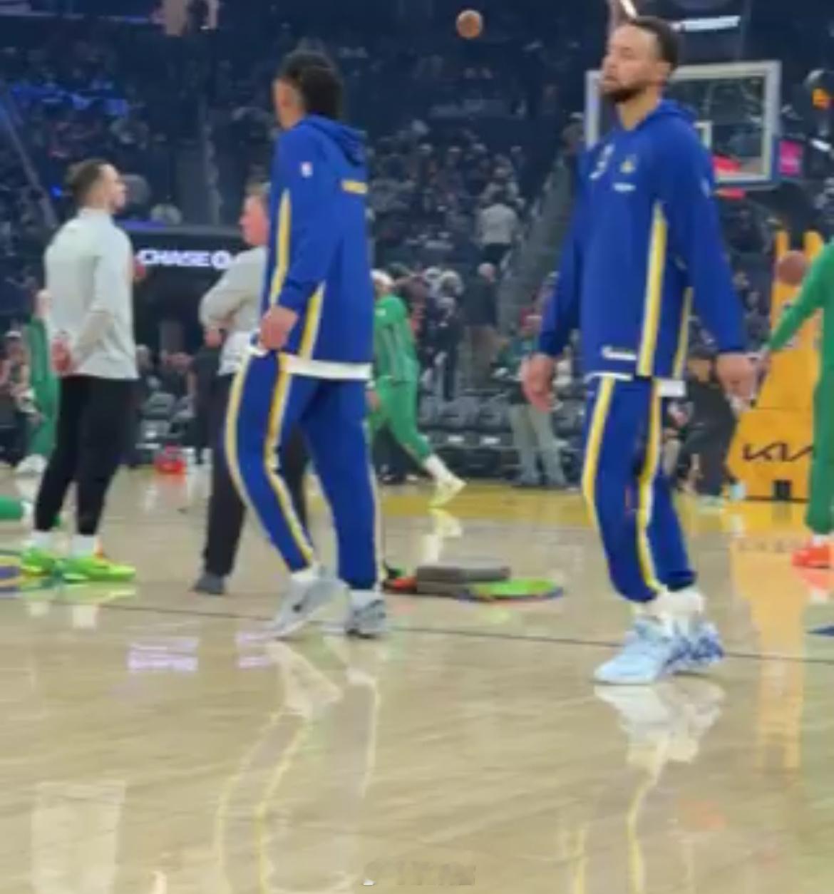 库里赛前热身还穿的耐克,比赛时换上了克莱的安踏签名鞋。