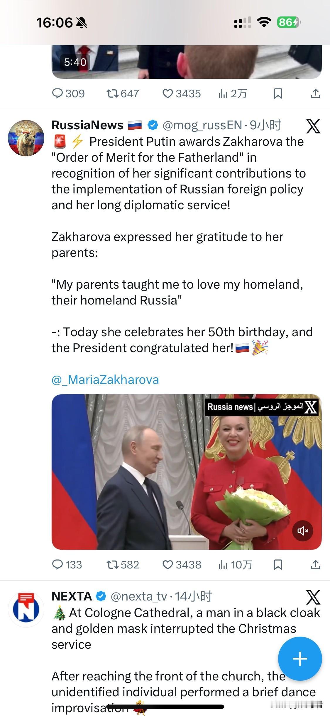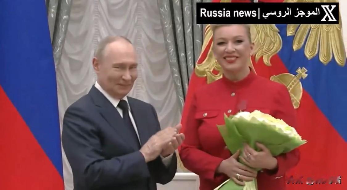 俄罗斯总统弗拉基米尔·普京向外交部发言人玛丽亚·扎哈罗娃(Maria Zakharova)颁发了“祖国功勋”勋章(四级),以表彰她对俄罗斯外交政策实施的重大贡献和多年的外交服务。 扎哈罗娃在克里姆林宫举行的国家授勋仪式上对父母表示感谢。 值得注意的是,扎哈罗娃当天恰逢50岁生日,普京总统也向她致以祝贺。