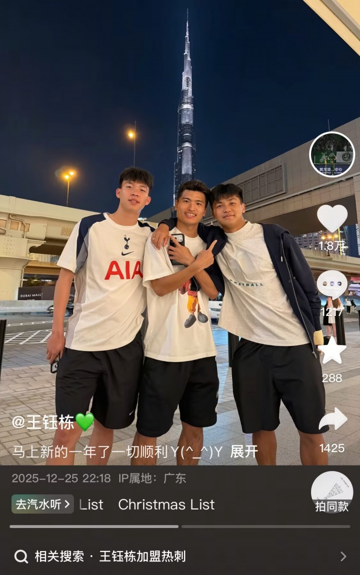 王钰栋照片上身着的是热刺球衣,评论区有球迷调侃:“重磅消息,herewego中国新星冬窗重磅加盟热刺。”