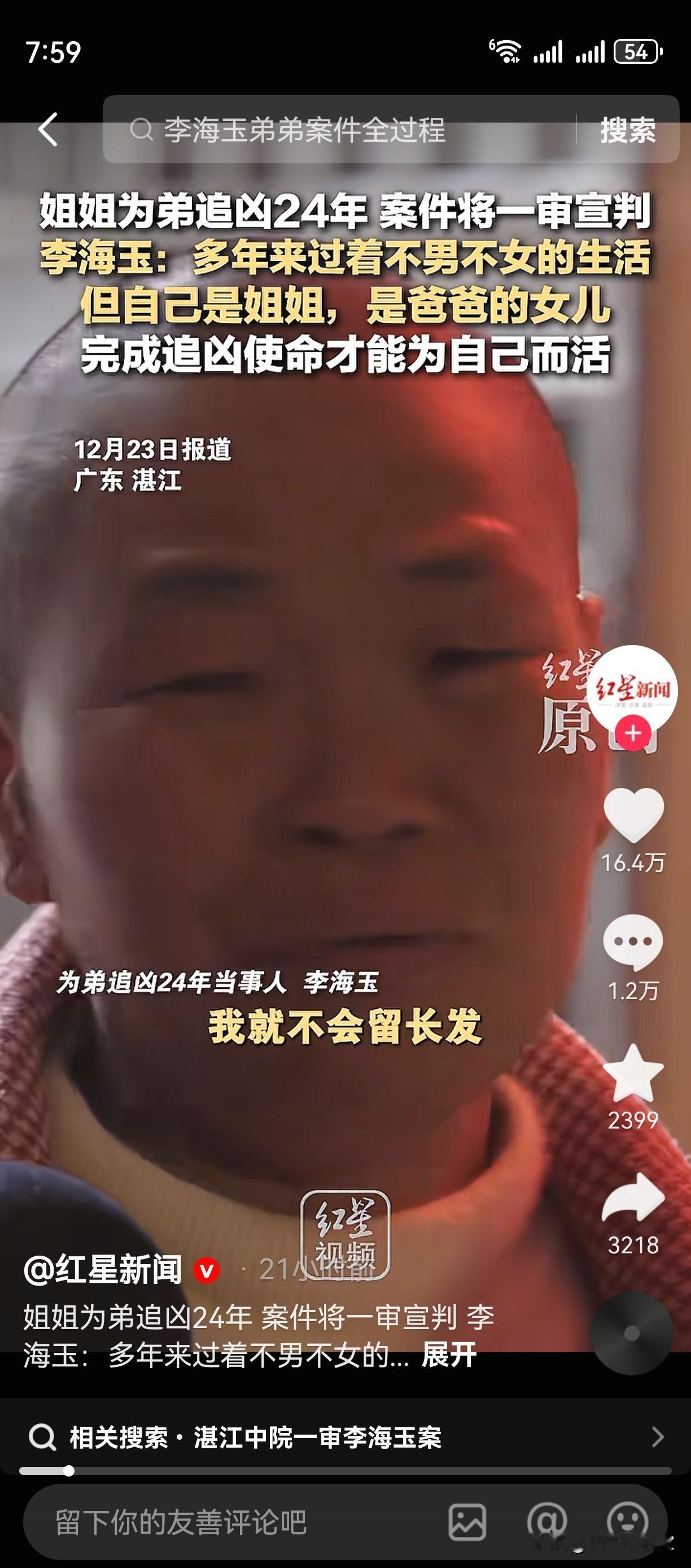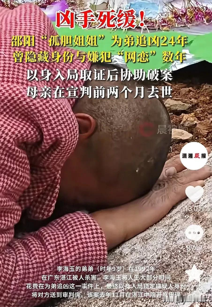 有这么一个女人,为了替30年前失踪,后来得知是被害的弟弟寻找凶手,耗尽了自己的大半生。终于在今年的12月迎来了最终结果。 这个广东湛江出生的女人,本来有个幸福的家庭,父母开厂,和弟弟一家其乐融融。可没想到有一天,弟弟失踪了,全家都以为是被拐卖了,于是姐姐天南地北的和爸爸到处寻找。 直到奔波了20年以后,爸爸找不动了,临终之际告诉姐姐,弟弟失踪的真相,原来当年因为一次结算工资,和某个人结了怨,他把弟弟骗到一处甘蔗地杀害了,他就地把弟弟埋到了某处,然后一直在找这个人,如今要把这件遗憾交给姐姐了。 知道真相的姐姐崩溃了,原来父亲一个人承受了这么多年,在那以后,姐姐也开始了爸爸的后路,不停的寻找这个人,终于在一次偶然的机会,他打听到某个人和爸爸描述的这个凶手很像,于是她花了三年的时间接近这个人,终于找到关键证据。 原来这个人行凶后就改了名字,怪不得一直苦寻不到,姐姐立马把这情况告诉了警方,又经过多年的波折,在今年的12月迎来了对他的法律的宣判。 死缓不足以让姐姐接受这个结果,姐姐剃发抗诉,这个人就是今年感动全网的李海玉,你有听过她的故事吗! (图片来自网络视频)