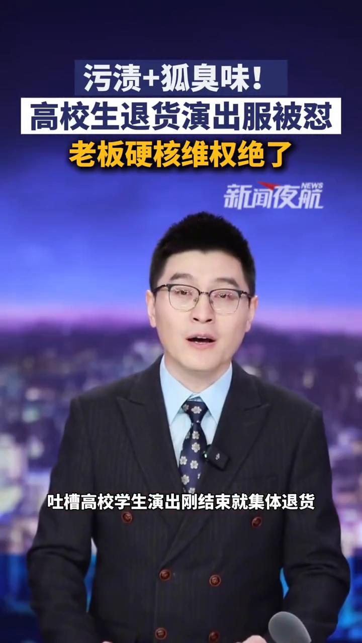 污渍+狐臭味!高校生退货演出服被怼,老板硬核维权绝了! 新闻夜航主播楚希。 家人们离谱的事件又增加了,山东一舞蹈服装店的老板直接开怼,吐槽高校学生演出刚结束就集体退货。您猜怎么着?退回来的演出服全是污渍异味,有的还带着狐臭味,根本没有办法二次销售。 这老板也是有备而来,早就录好了退货开箱视频,还存着学生演出的画面,直接网上曝光维权。校方回应倒是快,当天就督促学生把货款全结清了,老板还说这种事情不是第一次了。