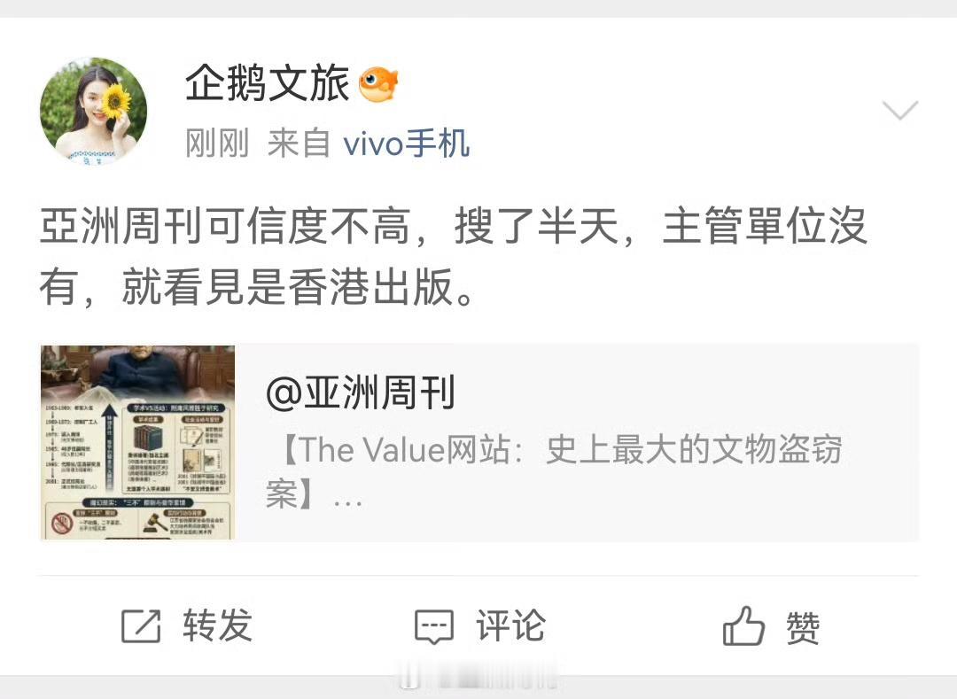 就在刚刚,港媒发文:“非遗传承人集中访问本号”的内容,文末用了“?”结束。附有6张截图,其中一张截图显示为具有认证标识,名称叫做“企鹅文旅”的账号,该号有发文称:“亞洲周刊可信度不高,搜了半天,主管單位沒有,就看見是香港出版。”(繁体字) 港媒这是在自黑,还是在释放什么信号?