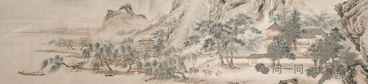 仇英(约1494—1552),字实父,号十洲,江苏太仓人,后迁居苏州,明代杰出画家。 他出身寒微,早年以漆工为业,后通过刻苦研习与临摹,成为全能型绘画大师,擅长青绿山水、工笔人物、界画等,其作品融合古典传统与文人雅趣,对后世影响深远。 画卷以手卷形式呈现,犹如一幅流动的江南春日画卷。《江南春图》堪称“工笔江南”的天花板。 近景一座临水山庄坐落于翠竹松柏之间,粉墙黛瓦,充满生活气息。院墙外桃李盛开,花瓣仿佛即将飘落,一位童子正在扫花,其手中扫帚的竹枝都描绘得极为清晰,足见仇英笔法之细腻。 中景绿柳掩映的石板桥上,两位士大夫骑着白马缓缓前行,他们头戴方巾,身着宽袖长袍,衣料褶皱与腰带结扣都刻画得细致入微,身后童仆挑着担子,神态憨态可掬。 远景山峦层层叠叠,以淡青和石绿晕染,山色空蒙,山巅的飞檐高阁与江面上往来的乌篷画舫、齐飞的水鸟,共同构成了一幅开阔而富有动感的江南春景图。 山石勾勒采用南宋李唐的“小斧劈皴”技法,线条短促有力却不失温润;画中童子扫花、蛮奴担棒的细节,更让静态的山水多了几分灵动。 仇英将院体画的精工与文人画的雅趣完美融合,成就了“工而不板、妍而不甜”的独特风格,也让这幅画被清代收藏大家顾文彬盛赞为“仇画第一”。