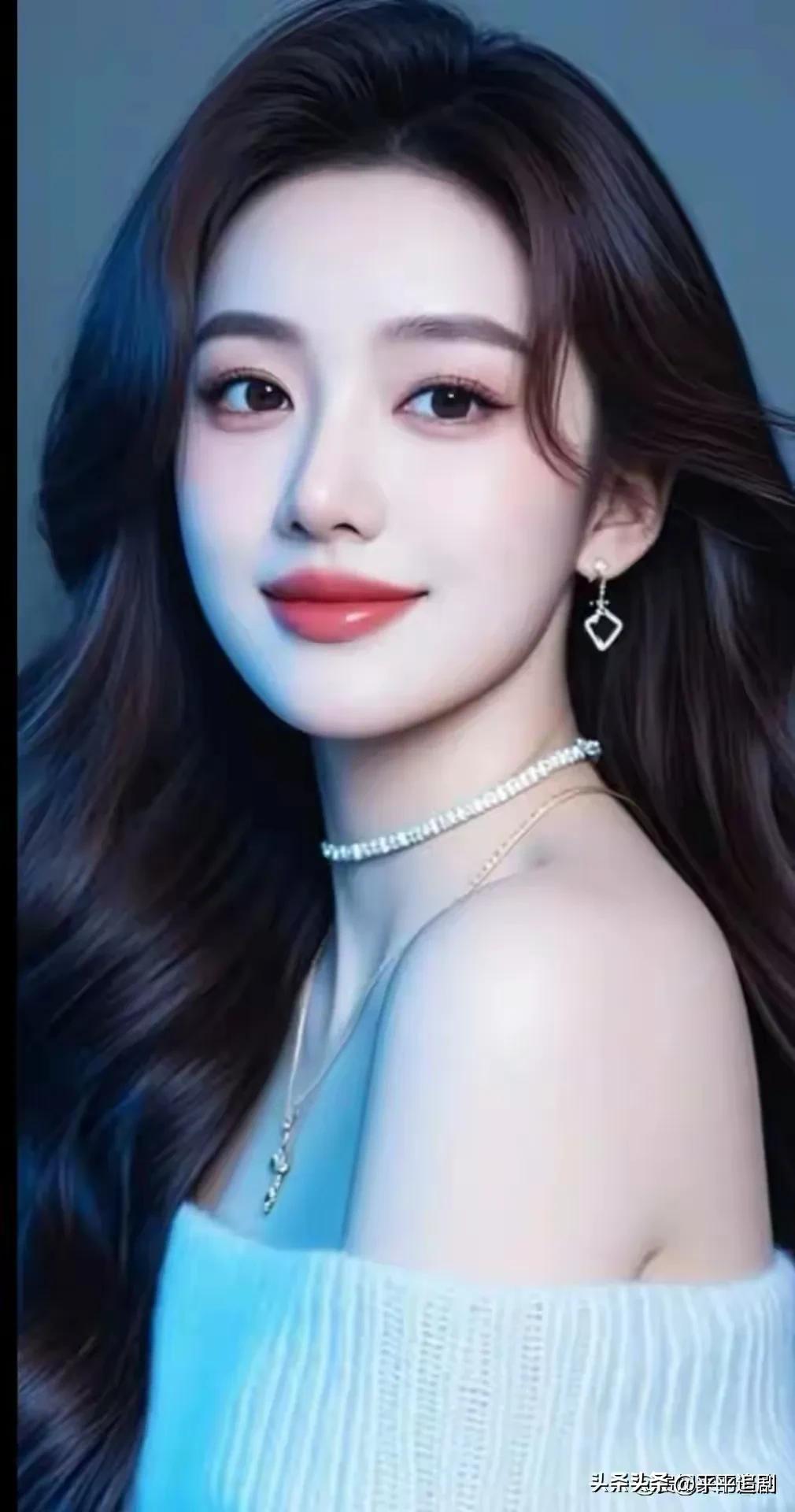 柔雾蓝调衬得肌肤莹润,珍珠颈链与菱形耳坠添了精致,卷发垂肩时的浅笑,是藏不住的甜