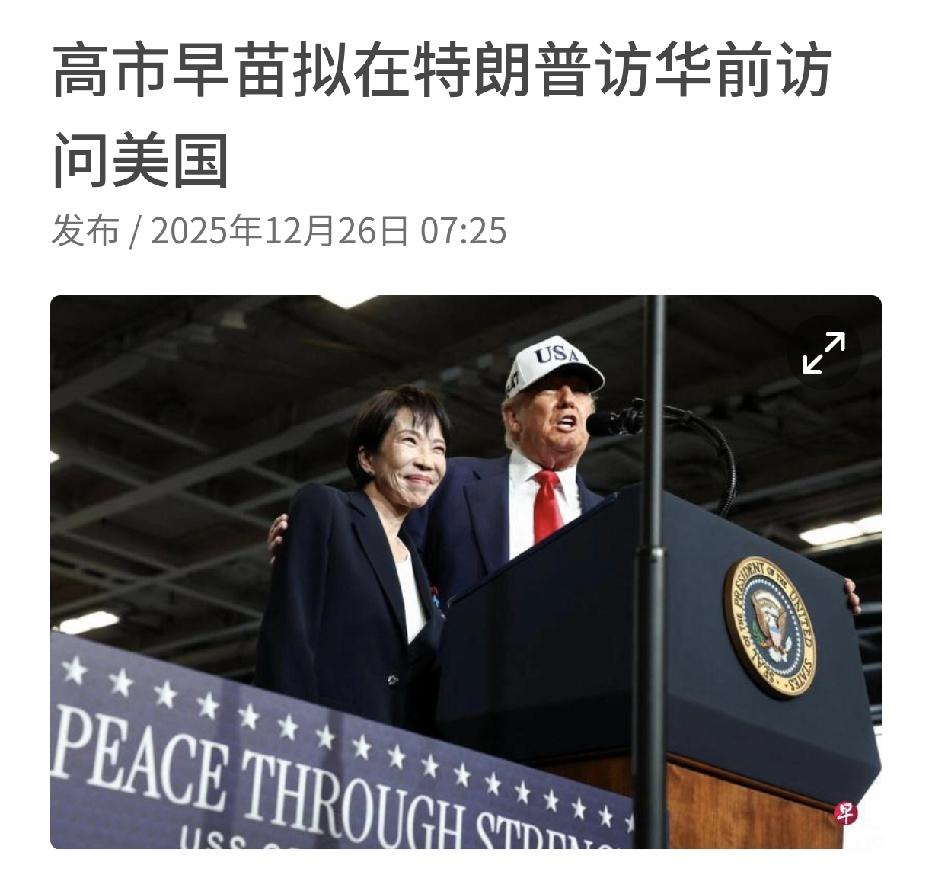 高市早苗准备行动了!来自外媒12月26日消息说,日本首相高市早苗公开表示,准备访问美国。 高市早苗强调,她的访问要赶在特朗普访华之前进行。 事实上,这就说明,高市早苗现在心里不踏实,害怕美国在访问我们之后,形成对日本不利的结果。所以,她要提前跑去美国做工作。 只是,有分析认为,高市早苗这样的做法,恐怕最终不会形成她想要的结果。毕竟对于美国来说,日本的影响力有限,而美国还想我们有更加多的利益往来。