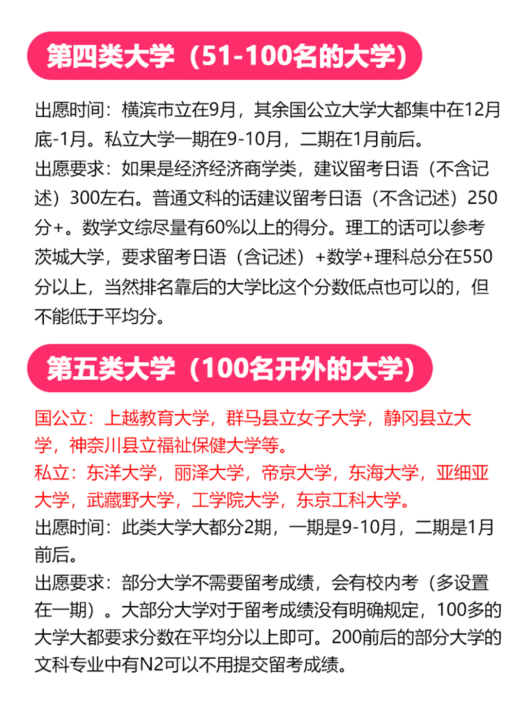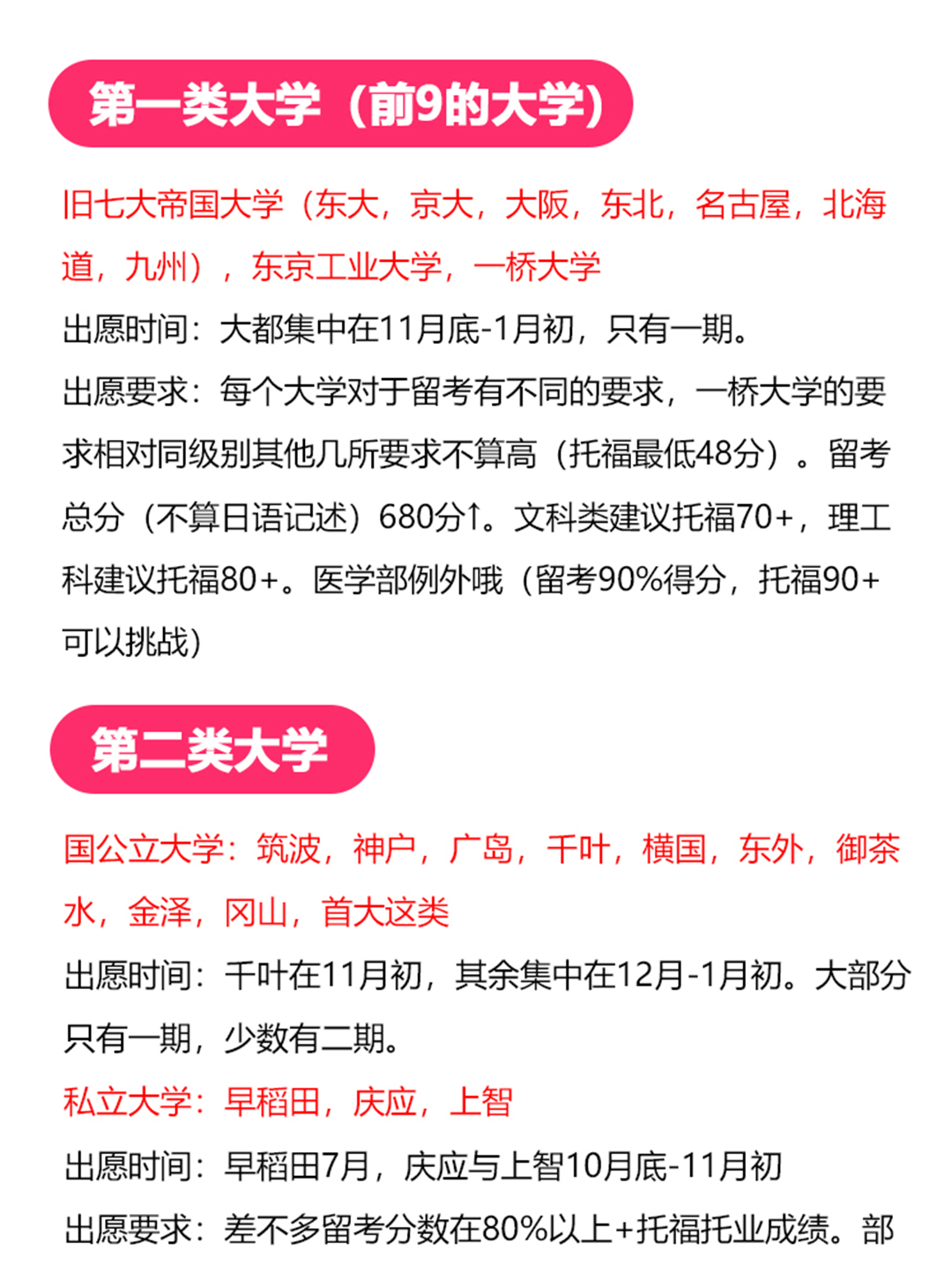 第一类大学(前9的大学) 旧七大帝国大学(东大,京大,大阪,东北,名古屋,北海道,九州),东京工业大学,一桥大学 出愿时间:大都集中在11月底-1月初,只有一期。 出愿要求:每个大学对于留考有不同的要求,一桥大学的要求相对同级别其他几所要求不算高(托福最低48分)。留考总分(不算日语记述)680分↑。文科类建议托福70+,理工科建议托福80+。医学部例外哦(留考90%得分,托福90+可以挑战) 第二类大学 国公立大学:筑波,神户,广岛,千叶,横国,东外,御茶水,金泽,冈山,首大这类 出愿时间:千叶在11月初,其余集中在12月-1月初。大部分只有一期,少数有二期。 私立大学:早稻田,庆应,上智 出愿时间:早稻田7月,庆应与上智10月底-11月初 出愿要求:差不多留考分数在80%以上+托福托业成绩。部分大学只能提交托福(东外不要求英语)。具体要去报考专业查询。建议总分在650左右的同学报考。 第三类大学 (前50名内,除第一类第二类的学校) 出愿时间:明治集中在9月,其他大学大都在12月-1月 出愿要求:留考要求日语(不算记述)280分↑,综合+数学280分↑,因此建议总分在600分左右的同学报考。英语要求要具体看报考专业。 第四类大学(51-100名的大学) 出愿时间:横滨市立在9月,其余国公立大学大都集中在12月底-1月。私立大学一期在9-10月,二期在1月前后。 出愿要求:如果是经济经济商学类,建议留考日语(不含记述)300左右。普通文科的话建议留考日语(不含记述)250分+。数学文综尽量有60%以上的得分。理工的话可以参考茨城大学,要求留考日语(含记述)+数学+理科总分在550分以上,当然排名靠后的大学比这个分数低点也可以的,但不能低于平均分。 第五类大学(100名开外的大学) 国公立:上越教育大学,群马县立女子大学,静冈县立大学,神奈川县立福祉保健大学等。 私立:东洋大学,丽泽大学,帝京大学,东海大学,亚细亚大学,武藏野大学,工学院大学,东京工科大学。 出愿时间:此类大学大都分2期,一期是9-10月,二期是1月前后。 出愿要求:部分大学不需要留考成绩,会有校内考(多设置在一期)。大部分大学对于留考成绩没有明确规定,100多的大学大都要求分数在平均分以上即可。200前后的部分大学的文科专业中有N2可以不用提交留考成绩。 第六类大学(200名以后的) 代表大学:秀明大学,桐荫横滨大学,圣德大学,杉野女子大学,鹤见大学,敬爱大学,淑德大学 出愿时间:第一期不建议报考,作为保底院校的话可以参加第二期或第三期的考试,多在2月前后。 出愿要求:基本只要求有N2或留考日语(200分+)即可,接近只要交钱就能去的大学了 第七类(专门学校) 出愿时间:好点的专门学校有3-4期,一般的专业学校会有6期左右。最晚的话在3月。 出愿要求:三者选择其一:有留考成绩,N2,参加校内考。交钱基本就可以上(日语初学者除外)。 以上,结合网络上的内容整理,供参考。并不是说留考考到了以上分数就可以顺利升学,如果EJU考试分数高,校内考和面试的压力相对会小一点。 因为各个院校或专业要求也不同,有的可能会要求EJU日本语的分数不可低于220分,而经济学、经营学、国际政治经济学这类专业很可能是需要英语成绩,所以备考时尽可能先确定好自己的升学方向,然后努力提高自己的综合实力,并有计划的应对校内考试和面试做准备。