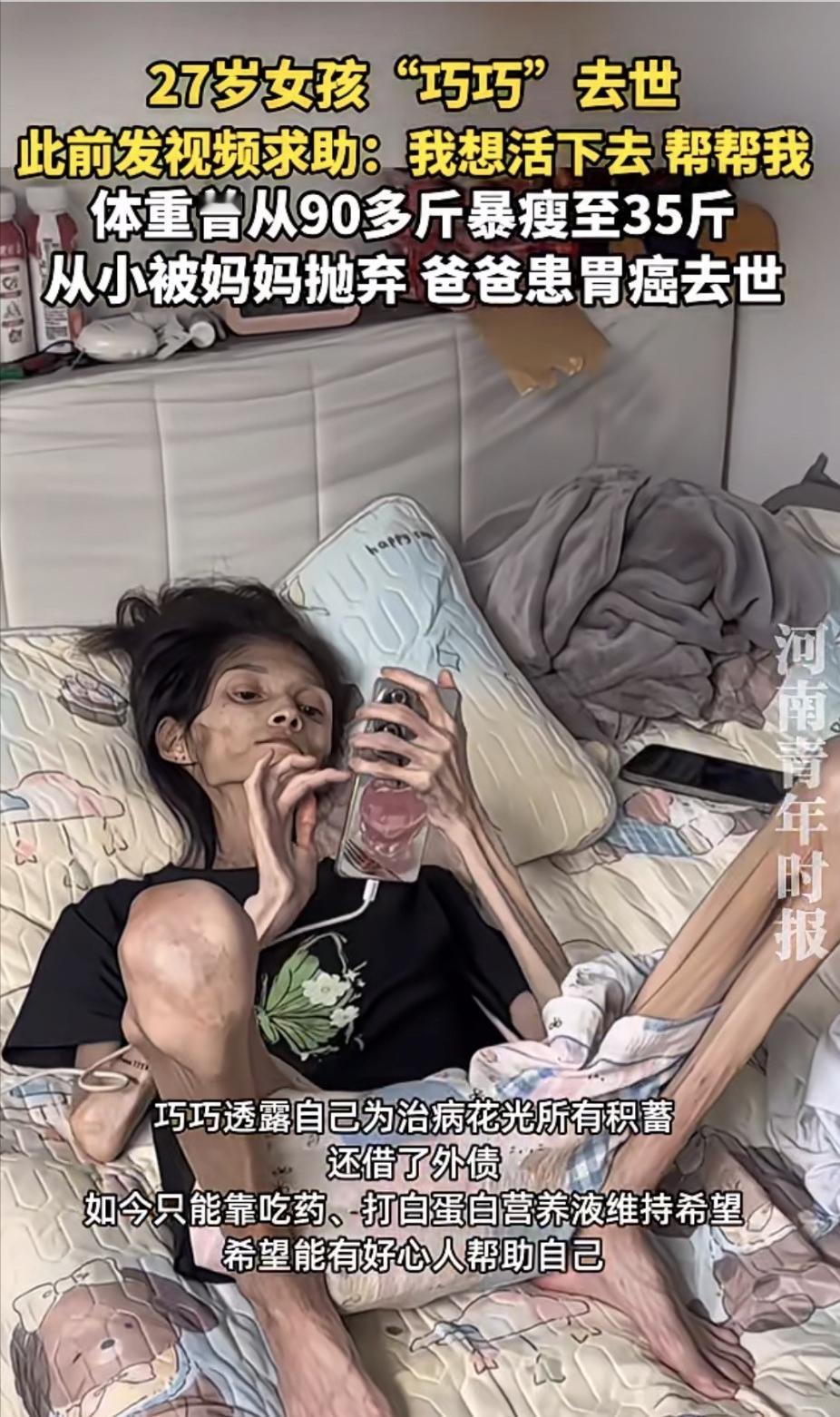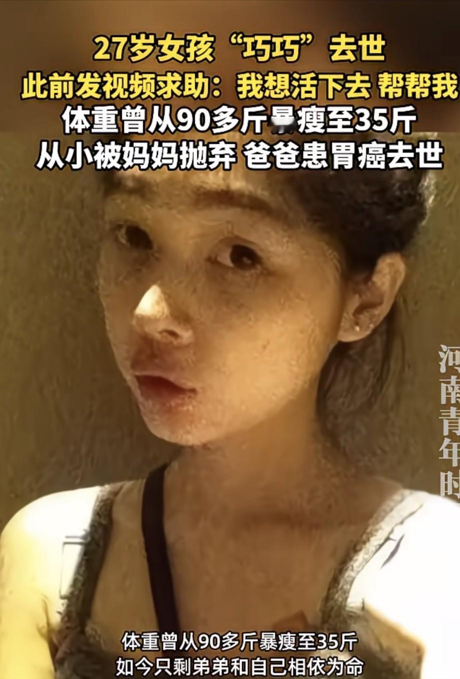 痛心!27岁女孩叶红巧(巧巧)永远离开了,图片里的她瘦得只剩一副嶙峋骨架,体重从90多斤硬生生掉到35斤,连坐起身都要拼尽全力。   巧巧的一生,真的太苦了。   从小就被妈妈抛弃,只能跟着爸爸相依为命,本以为能靠着爸爸的陪伴安稳长大,可命运偏要对她下狠手。   几年前,爸爸被查出胃癌晚期,最后还是没能留住,撒手人寰。   接连失去至亲的打击,让这个原本就敏感的姑娘彻底垮了,之后她就患上了严重的抑郁症,整夜整夜睡不着觉,饭也吃不下几口。   一开始只是胃口不好,大家还以为是情绪低落导致的,没太在意,可慢慢的,她吃点东西就腹胀恶心,体重掉得越来越快。   去医院检查后,才确诊是重度胃萎缩,巧巧的胃部已经没有消化功能了,吃不下东西才,每天都生活在痛苦之中。   从7月份她发布求助视频引发关注,到最终离世,这几个月里,她一直在和病魔苦苦抗争,可奇迹终究还是没有出现。   患病之后,巧巧的日子过得更难了。   她和弟弟相依为命,为了治病,不仅花光了家里所有的积蓄,还欠了一屁股债。   后来实在走投无路,她才选择向外界求助。   网红“战神宝马”听说了她的坎坷际遇后,特意上门探望,还伸出了援手。   当时的巧巧已经瘦到不成人形,只能终日躺在床上,本应该是好好享受人生的年纪,却被病痛折磨得不成样子,不少网友看了都心疼得直掉眼泪。   村里的人也证实了她离世的消息,还提到巧巧家里还有爷爷和弟弟,之后村里也会多关心这个破碎的家庭。   巧巧平时生活习惯不太好,老是爱喝饮料,这或许也加重了她的病情。   现在想想,要是她能早点得到好好的照顾,要是抑郁症能及时得到疏导,是不是结局就会不一样?   得知巧巧离去的消息,很多网友都在留言悼念,希望她一路走好,在天堂没有痛苦。   对巧巧来说,或许离开也是一种解脱,毕竟被病痛折磨的日子,实在太煎熬了。 可一想到她才27岁,还没好好感受过世间的温暖,就这么匆匆离开,还是忍不住让人惋惜。   希望天堂再也没有病痛!