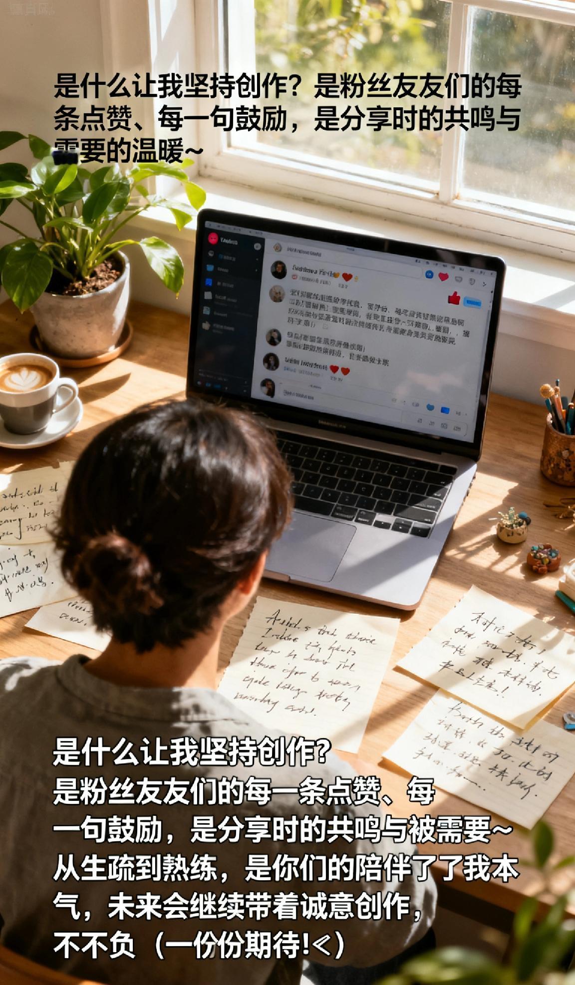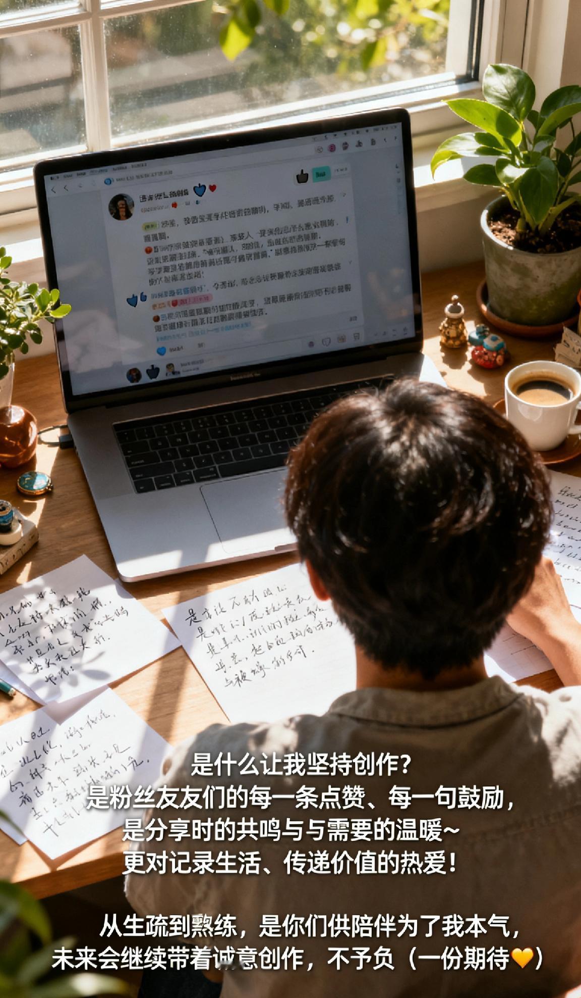 欢迎发文分享是什么让你坚持创作?是什么让我坚持创作?是粉丝友友们的每一条点赞、每一句鼓励,是分享时的共鸣与被需要的温暖~ 更是对记录生活、传递价值的热爱!从生疏到熟练,是你们的陪伴给了我底气,未来会继续带着诚意创作,不辜负每一份期待❤️坚持创作的动力 感谢粉丝一路陪伴 热爱可抵岁月漫长 诚意创作不辜负