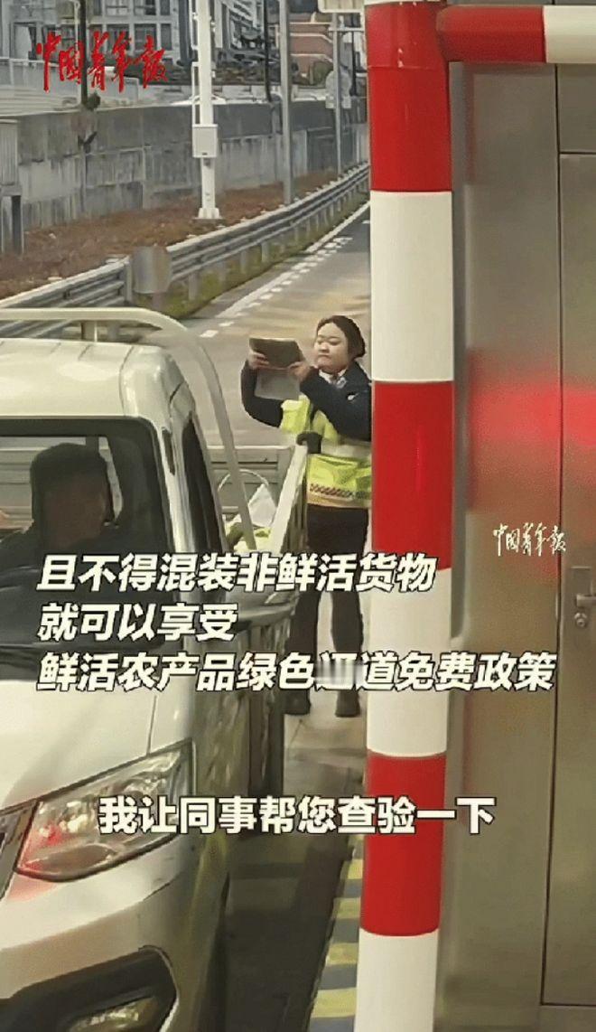 浙江,高速收费口,一卡车司机交完高速费,刚挂挡准备开车走人,收费员无意间往车厢瞟了一眼,立马喊住他:“你把行驶证拿出来我看看!” 连续开了六个多小时的车,卡车司机王师傅(化名)的神情里带着掩不住的疲惫,副驾驶的大姐也靠在椅背上闭目养神。   12月24日下午,他们驾驶着满载橘子的卡车,抵达浙江杭干高速收费口。   王师傅熟练地递上通行卡,扫码缴完高速费,伸手揉了揉酸胀的肩膀,脚下轻轻踩住离合,准备挂挡驶离。   抬杆的嗡鸣声已经响起,他知道再踩一脚油门,就能去服务区歇口气了。   就在车轮即将转动的瞬间,收费窗口里的工作人员忽然探出头,朝着他的方向挥了挥手。 王师傅心里犯起嘀咕,慢慢把车停稳。   他不是不知道鲜活农产品能走绿色通道免高速费,只是自己常年拉建材,很少接触水果运输,对政策的具体要求只停留在“听说过”的层面。   车厢里的橘子没装满,他甚至不确定这样算不算符合标准,更别提想象中要准备一堆材料、走一串审批流程的麻烦事,所以从没想过要主动申请减免。   工作人员没多耽搁,抬手示意他出示行驶证。   王师傅应声翻找证件的功夫,已经有另一位工作人员拿着手持称重设备走到了车厢旁,动作麻利地核对货物、记录数据。   窗口里的收费员则对着行驶证上的核定载重量,手指在计算器上快速敲击,眼神专注又认真。 副驾的大姐也醒了过来,探着身子看向窗外,眼神里带着几分好奇和忐忑。   不过几分钟的功夫,称重数据就传到了收费窗口。   收费员核对后,确认车厢里的橘子重量达到了核定载重量的85%,完全满足绿色通道的免费要求。   她随手拿起旁边的相机,对着行驶证、货物和称重数据拍了几张留存,随后便开始在系统里操作退款流程。   王师傅站在车窗边,看着工作人员有条不紊地处理,之前的疑惑慢慢变成了惊讶。   他原本以为要折腾半天的事,竟然这么顺利,连多余的表格都没让填一张。   随着收费员的操作完成,退款已经实时到账,手机提示音清脆地响起。   副驾的大姐听到提示音,脸上瞬间露出了笑容,眼角的褶皱里都透着轻松,她轻轻拍了拍王师傅的胳膊。   这份开心里,有省下路费的踏实,更有对政策便利的意外惊喜,原来惠民政策不是停在纸面上的条文,也不用经历层层关卡,在收费口几分钟就能兑现。   王师傅愣了愣,随即露出了释然的笑容,对着工作人员点了点头表示感谢,重新挂挡驶离。 夕阳的余晖洒在收费口的栏杆上,车流依旧来来往往。   对收费员来说,这只是工作中一次再常规不过的操作,却让长途奔波的司机感受到了实实在在的温暖。   很多时候,好政策的价值,不仅在于政策本身的善意,更在于落地时的温度和效率。   政策好,更要真正落地生根。   当繁琐的流程被简化,当一线工作人员多一份细心和主动,惠民政策就能精准触达每一个需要的人,这也是最动人的民生温度。