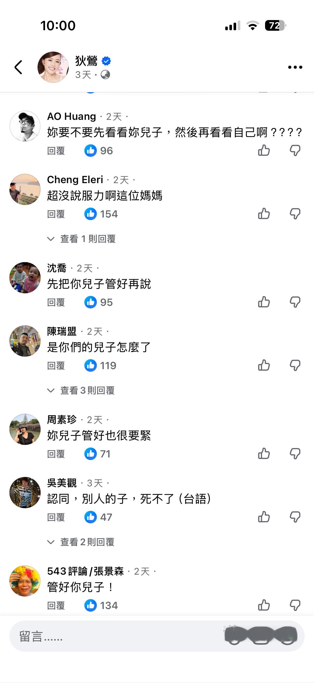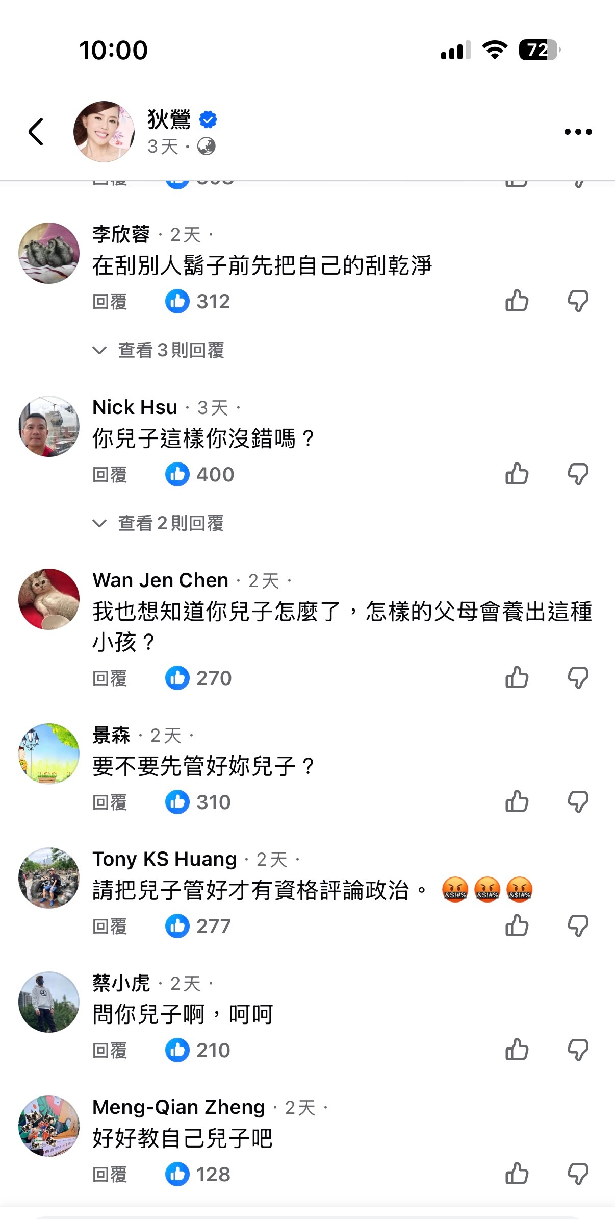 狄莺发文谈及台北车站随机攻击事件,她无奈感叹:「台湾到底怎么了」!贴文一出引发网友炮轰留言:「先把自己儿子管好」、「当年在美国扬言恐💣攻击」、「差点干大事的人不是你儿子吗?」等。对于网友炮火,狄莺回应台媒态度淡然,表示早已习以为常,并表示孙安佐目前正在国外旅游,其余细节不便多谈。