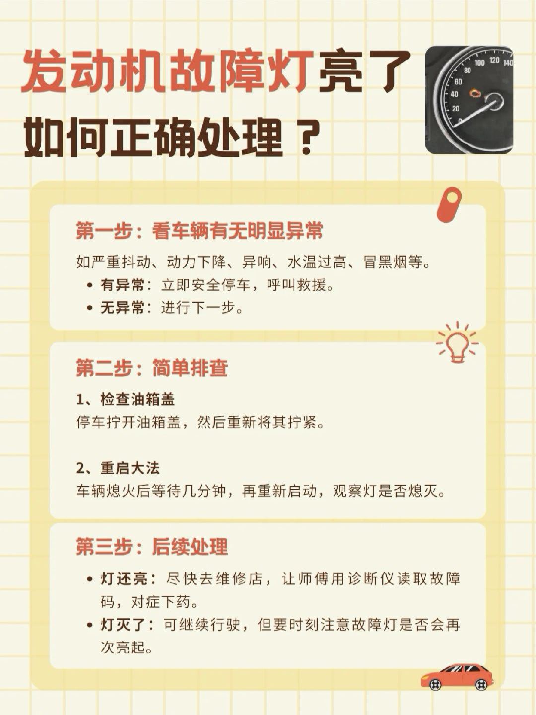 仪表盘上的发动机故障灯亮了💡但是感觉车子没啥问题,继续开车会有问题吗❓✅可以短途开,但必须尽快检修❗发动机灯亮的常见原因:1️⃣油箱盖没拧紧2️⃣传感器信号偶发失准3️⃣火花塞/点火线圈老化4️⃣三元催化器异常5️⃣节气门积碳✅两步自查法:STEP1:观察车身状态有无严重抖动/动力下降/异响/水温高/冒黑烟👉有异常→立即停车叫救援👉无异常→继续下一步STEP2:简单排查1️⃣重新拧紧油箱盖2️⃣熄火几分钟后重启 看故障灯是否熄灭灯还亮→尽快去维修店检查灯灭了→可以继续开但需持续观察大v聊车我与汽车的日常