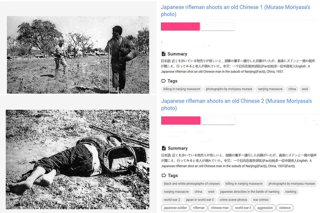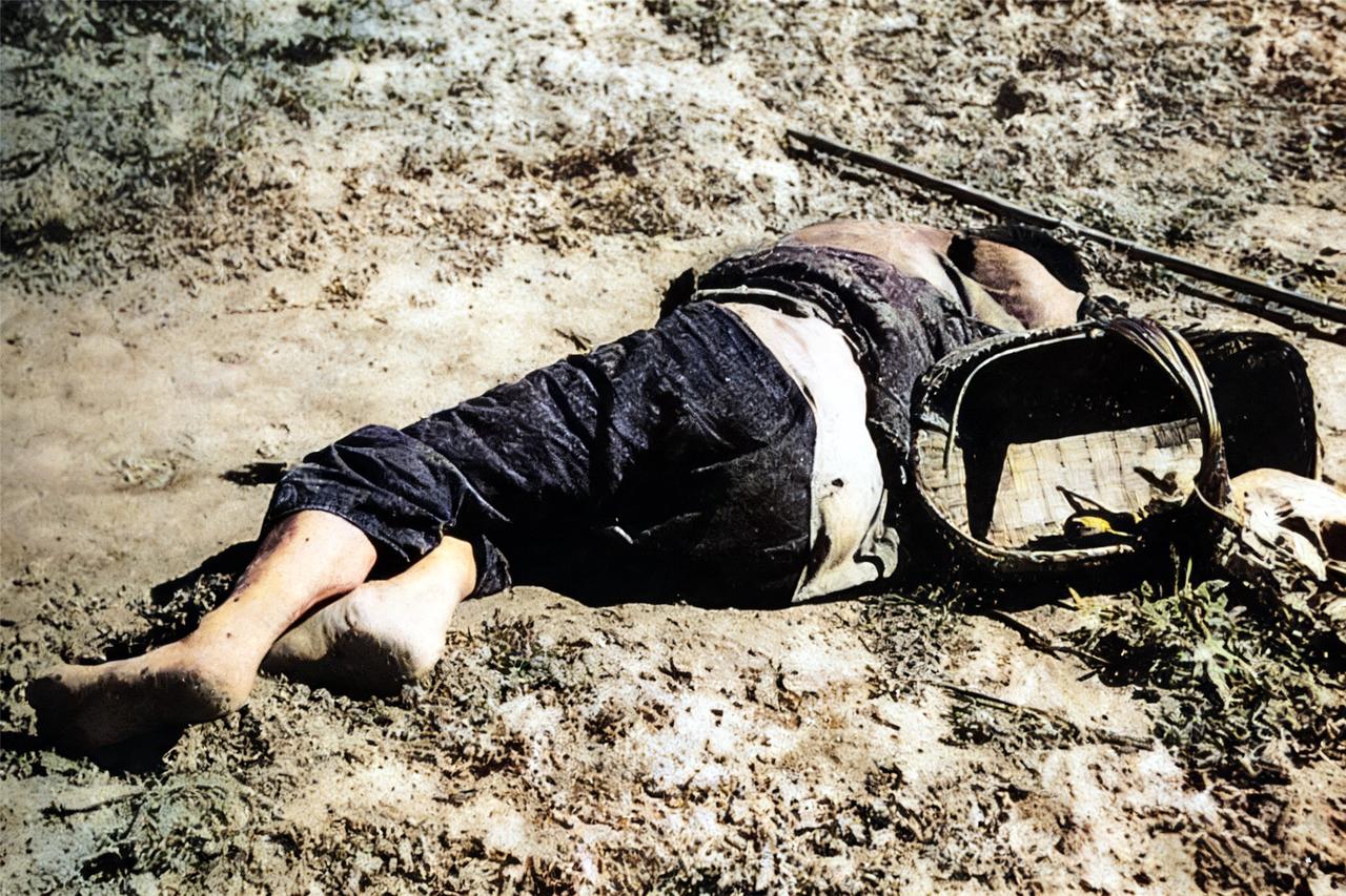 这是日本侵华时期在南京郊区发生的一幕,一个日本摄影师完整记录了下来。 日本兵认为一个在附近走动的小贩形迹可疑,不加任何询问,便直接枪杀了他。 其实,画面中的男子并不是什么小贩,只是一名因为身体虚弱拄着棍子四处流浪的乞丐。滚落在地上的竹篮子里空空荡荡,说明他对日本人没有任何威胁。这两张照片如此完整地把整个事件呈现出来,不得不让人怀疑是日本摄影师和日本兵共同策划的谋杀。 国破之时,任何国人的生命在侵略人眼里都是蝼蚁。即便是人畜无害的叫花子也不例外。