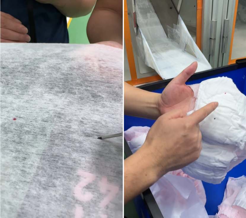 为了验证其灵敏度,记者在一卷即将进入产线的无纺布上,用笔尖点下一个直径毫米极的微小的墨点。随着原料在机器中飞速传送,带有标记的安心裤被精准识别并从剔除口推出。这套系统对每片产品都在进行这样的判断,任何带有细微的异物、尺寸偏差或封合瑕疵的产品都无法“逃逸”。