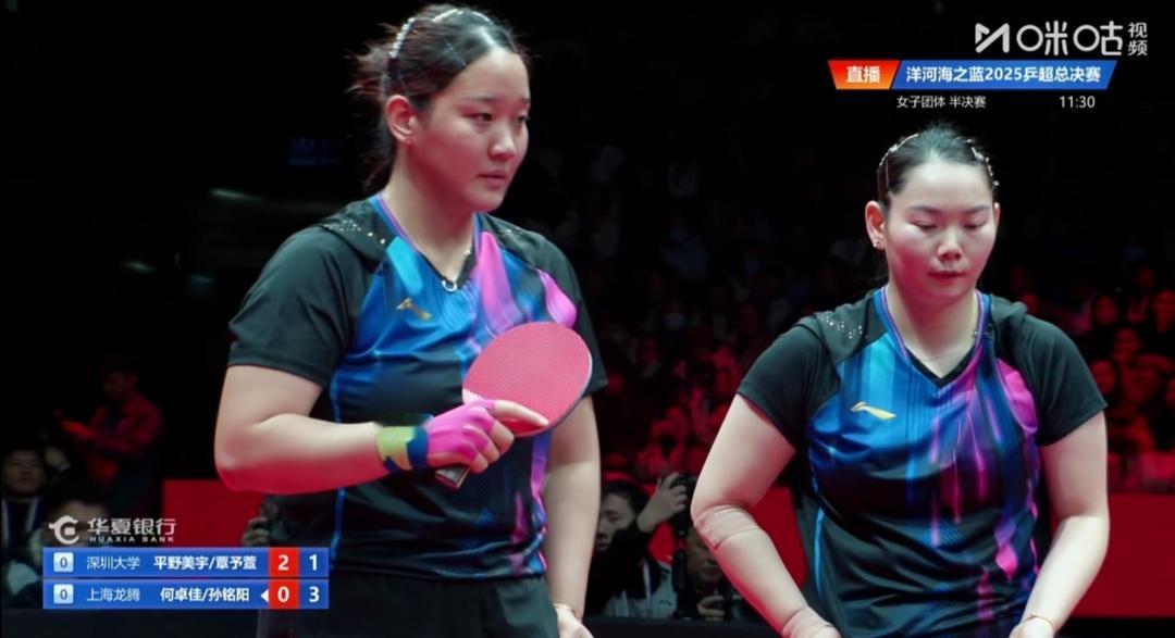 乒超总决赛女团半决赛 深圳大学Vs上海龙腾 深大莎莎缺席,小将蒯曼一单! 2025乒超总决赛在南京举行 11:00 女团半决赛 深圳大学Vs上海龙腾 深圳大学少了世界排名第一的孙颖莎,一单就变成了小将蒯曼了。 第一盘 双打 覃予萱/平野美宇3:2(11-7;11-8;8-11;11-13;11-9)决胜局两分绝杀上海龙腾何卓佳/孙铭阳。 第二盘 蒯曼Vs上海龙腾刘炜珊 第三盘 覃予萱Vs上海龙腾孙铭阳 第四盘 蒯曼Vs上海龙腾何卓佳 第五盘 平野美宇Vs上海龙腾刘炜珊 比赛正在进行中!