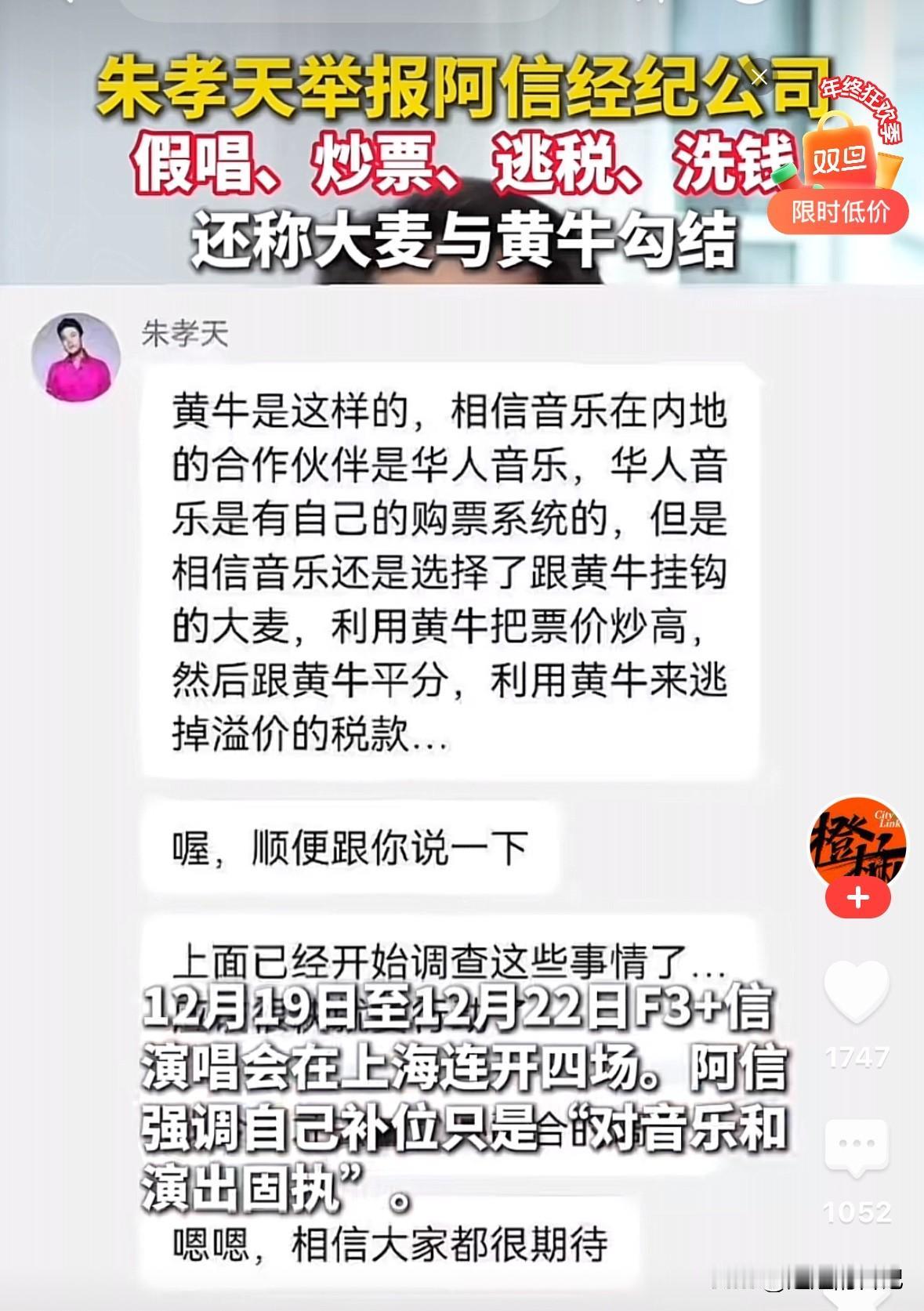 朱孝天出来举报阿信经纪公司,假唱,炒票,逃税,洗钱,不知道举报的事情是真是假,如果是真,问题就很大了。 之前的f3音乐会,我还纳闷朱孝天为啥没参加呢,这个时候突然出这个事,看来是做了充足的准备,他们之间的矛盾已经很深了。 实际这些人有问题是大概率的,就是能不能被发现。