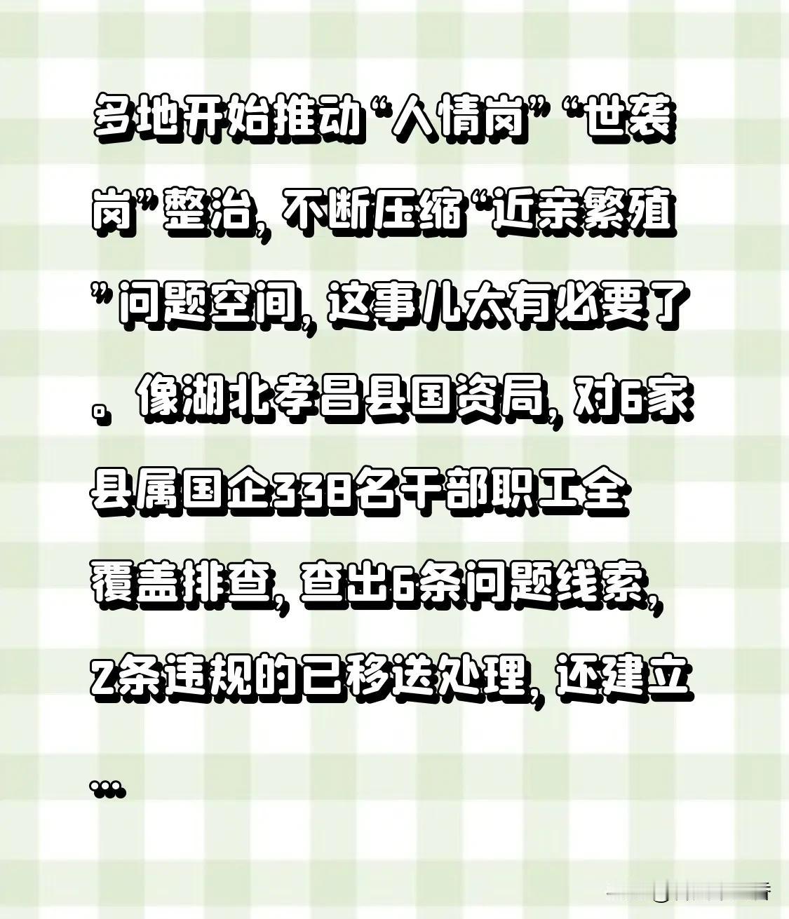 多地开始推动“人情岗”“世袭岗”整治,不断压缩“近亲繁殖”问题空间,这事儿太有必要了。像湖北孝昌县国资局,对6家县属国企338名干部职工全覆盖排查,查出6条问题线索,2条违规的已移送处理,还建立了报备机制。内蒙古霍林郭勒市排查7441人,完成13人的任职回避整改。 公平公正用人是原则,只有这样才能选出真正的人才。“近亲繁殖”不仅破坏公平,还影响单位发展。国家和地方都在努力整治,希望能彻底铲除这种不良现象的土壤,让用人环境风清气正。