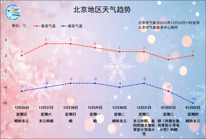 下周前期,北京天气仍以晴到多云为主,气温波动不大;预计2026年1月1日前后,北京有一次明显冷空气活动,将有明显降温,西部北部地区还可能有弱降雪天气。由于预报时效较远,不确定性大,还请大家及时关注临近预报,根据天气变化安排出行计划。
