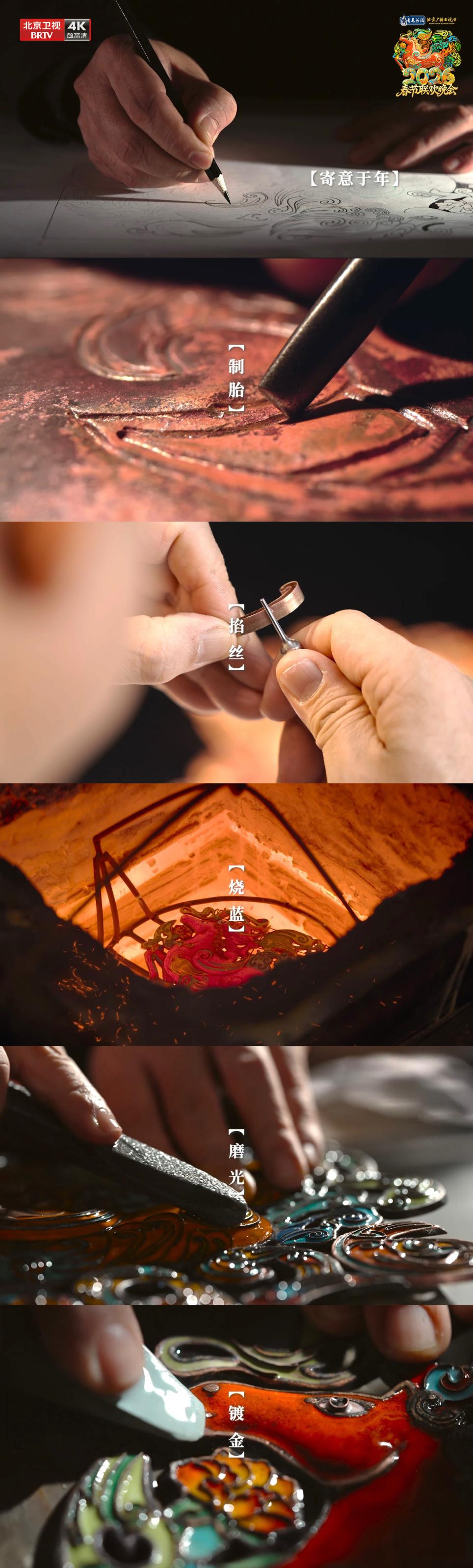 今年春晚的LOGO背后,承载的是一部“非遗工艺的微缩史诗”。它生动复现了“燕京八绝”之一——铜胎掐丝珐琅的完整精妙工序:从锻打铜胎为骨,到金丝掐作经脉;从釉彩点蓝为肌,到窑火反复淬炼其魂;最终经打磨鎏金,一匹骏马终于在时光与匠心的交融中,披覆流光,跃然而出。这份源自历史深处的匠心与祝福,被精心注入春晚的视觉灵魂之中。整台晚会不仅是对传统技艺的崇高致敬,更是一份以现代美学传递的深情新春贺礼。