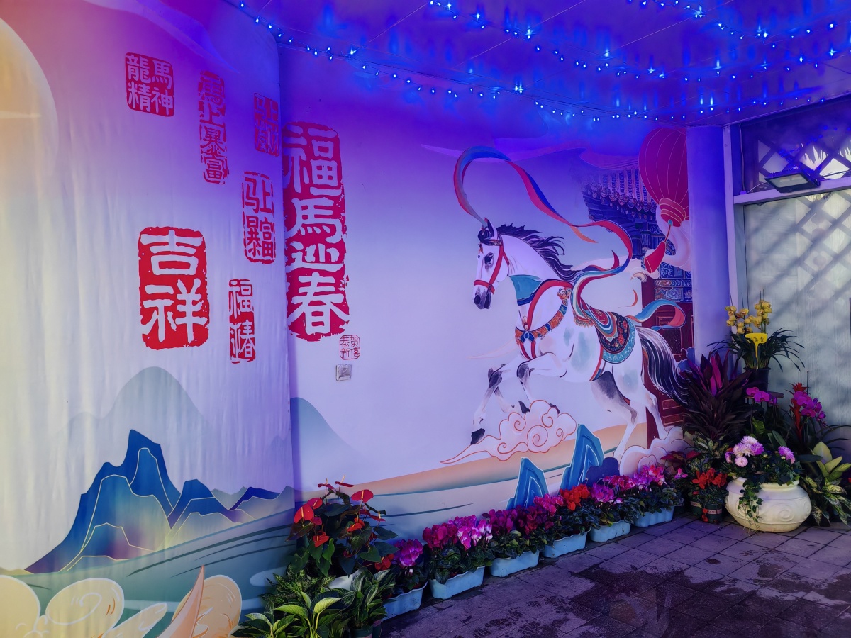 各展区特色鲜明、层层递进。“马上有福”以骏马托福、春联结彩营造浓厚年味;“马到成功”融合河南山水人文与主题花卉马蹄莲,诠释“归处即是功成”的深意;“龙马精神”通过金龙盘柱、飞马踏云与蝴蝶兰“春”字,传递自强不息的文化内核;“天马行空”以白色天马、星空灯光与休憩区,打造自由遐想的沉浸式空间;“马踏祥云”以红色骏马、层叠屏风与蝴蝶兰,勾勒“前程似锦、家灯温暖”的东方画卷;花卉展示区依托热带雨林原生景观,构建五彩斑斓的立体花瀑,呈现原始绿意与繁花生机的共生之美。