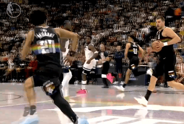 第三节比赛中,约基奇反击助攻默里上篮得手,前者砍下27分11篮板10助攻,本赛季第15次砍下三双。