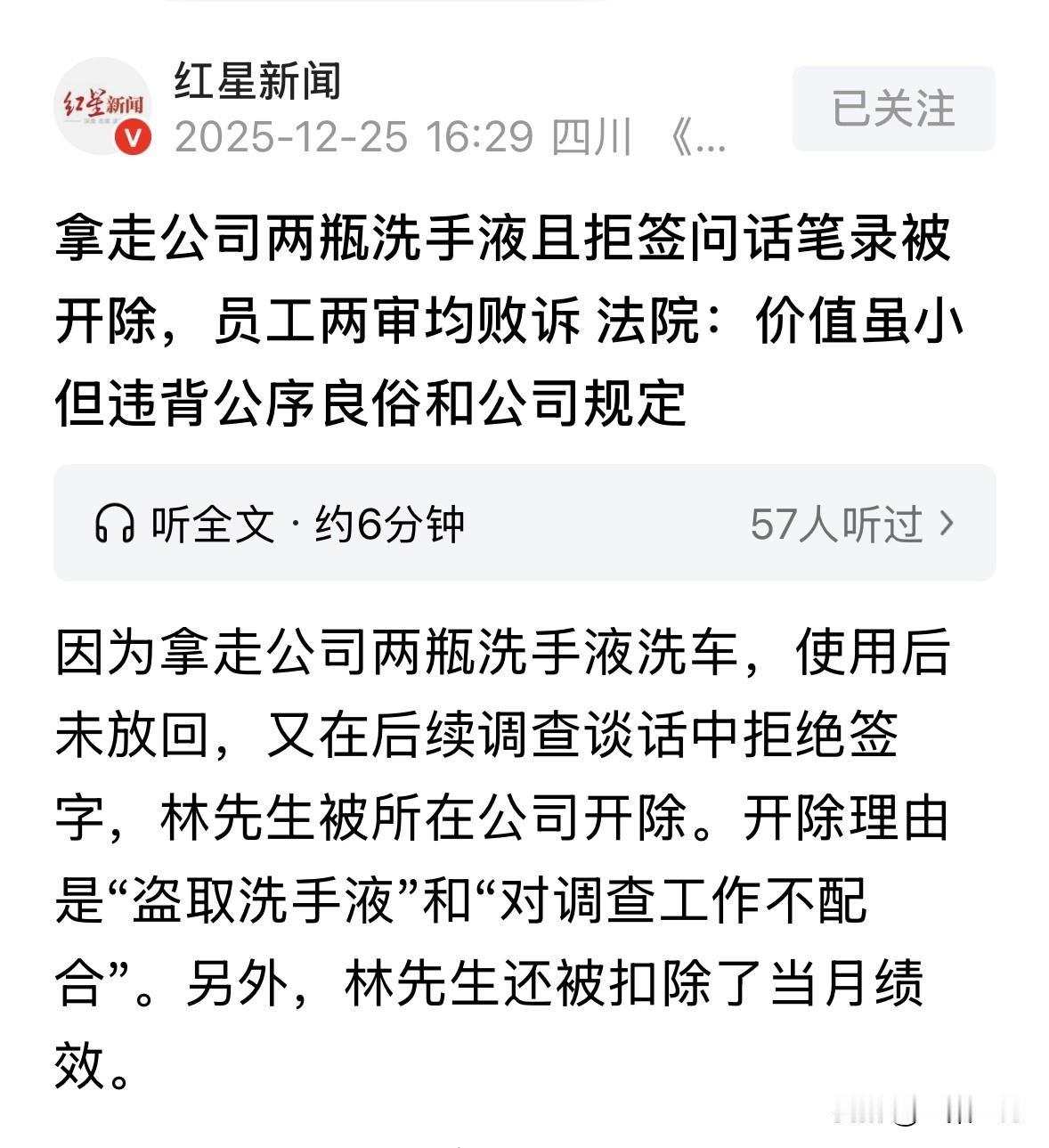 广西玉林,男子拿走公司2瓶洗手液,用于洗自己的车,洗完他忘记物归原位,公司发现后,认定男子这是盗窃,要求男子配合谈话,并签字确认谈话内容,男子不认可谈话记录上的“盗窃”定性,拒绝签字,公司扣了他当月绩效,男子以为罚都罚了,事情到这就结束了,哪成想,没过多久他就遭到解雇,仲裁失败后,他两次提起诉讼,却都败诉了。男子认为,公司太过小题大做,公司却有不同说法。 2024年6月的一天,林先生在公司食堂门口的公用洗手台上,看到了摆放着的2瓶洗手液。 他顺手拿走了一瓶,后来又一次拿走了一瓶。 他不是为了带回家用,而是想着用这些洗手液来清洗自己的私家车。 用完以后,他忘了及时放回原处。 不过在他看来,这不过就是借用未还,不是什么大事。 然而,公司方显然不这么看。到了7月份,有调查人员找到林先生谈话,指出他拿走了2瓶洗手液的事情。 林先生承认是自己拿的,也说明了用途。得知公司很在意这事,他很快去买了2瓶新的同样牌子的洗手液,放回了原来的位置,以示归还。 他当时还觉得,东西都还了新的,这事应该算翻篇了吧? 可事情并未结束。在调查过程中,林先生被要求配合谈话并签字确认谈话内容。 但当他看到谈话记录时,上面多次出现了“盗窃”、“偷盗”这样的字眼。 林先生这下急了,说我承认拿了东西没及时还,也买了新的还回去了,怎么就成盗窃罪了? 他觉得这个定性太重,完全不能接受。因为这个原因,他最终拒绝了在谈话记录上签字。 在归还洗手液后不久,林先生7月份的绩效工资被扣除了。 公司给他的月度考核表上写着,扣钱的理由是他“在2024年二季度占用盗取公司公共物品”。 林先生心里虽然憋屈,但想着钱扣了,东西也还了,这事总该彻底了结。让他万万没想到的是,更大的风暴还在后面。 时间来到同年12月,他突然收到了公司发来的正式文件,也就是解除劳动合同通知。 通知书上写着:林先生在6月份两次“偷窃”公司洗手液,并且在公司调查期间,“不如实说明”、“不配合调查”、“拒绝签字”、“不服从管理”、“拒不承认错误”。 公司认为,这些行为严重违反了公司的规章制度,因此决定解除与他的劳动关系。 接到这份开除通知,林先生心情难以言喻,他觉得这处罚简直重得离谱,完全无法接受。 就因为2瓶洗手液,而且后来都还了新的,不仅扣了当月工资,还要开除? 更让他憋屈的是,7月份已经为此扣过绩效罚过钱了,到了12月又来开除,这不是一件事罚了两遍吗? 咽不下这口气的林先生,先是提起了劳动仲裁,但仲裁结果不支持他。他不服气,又向法院提起诉讼,结果一审败诉了。 他继续上诉到中级人民法院,结果在2025年12月出来的终审判决,还是驳回了他的上诉,维持了公司的开除决定。 根据《劳动合同法》第39条第2项规定:劳动者有下列情形之一的,用人单位可以解除劳动合同:严重违反用人单位的规章制度的。 法院在判决书里是这么解释的:林先生2次拿走洗手液的行为,虽然东西本身价值不大,但这个行为确实构成了对公司财物的侵占,违背了公序良俗,同时也违反了公司的管理规定。 另外,他在调查过程中拒绝在谈话记录上签字,这个行为导致公司的调查工作没办法顺利进行,法院认为这属于“不服从管理”。 法院最终认定,林先生和公司之间的信任基础已经因为这两件事严重受损,不存在了。 所以,公司依据自己制定的规章制度和《劳动法》的相关规定解除劳动合同,是合法的。 在法庭上,公司这边还做了些补充说明。 他们说,虽然公司对普通员工的廉洁要求并不是最高的,但林先生在他的工作岗位上,是有可能接触到现金的,所以公司对他这方面的要求自然就比对其他一般员工要高。 因此,即便是像拿走洗手液这种“小偷小拿”的行为,放在林先生身上,性质也会显得更严重一些,小错在特定岗位上可能也会被放大。 再者,公司认为他在调查中“对抗组织调查”,也是情节严重的一点。 公司还强调,这些规章制度,包括林先生在内,都是组织大家学习过的。 这件事情被报道后,有律师接受采访时觉得不太合理。这位律师表示,就因为两瓶洗手液就要开除员工,这处罚是不是太严厉了?有点像小过错给大惩罚。 不过,也有另外的律师表达了不同的观点。他们认为,虽然洗手液本身不值多少钱,但从行为的性质上说,员工私自拿取公司的财物,这本身就违背了基本的职业操守和诚信原则。 从维护公司管理和纪律这个角度出发,支持公司解除合同也有它的道理。 对于法院的判决和公司的解释,林先生依然充满了不解和委屈。他无法认同仅仅因为2瓶洗手液就被扣上“偷窃”、“对抗调查”的大帽子,最终丢掉了工作。 对于这件事,你怎么看? 欢迎关注@一案一论