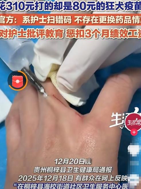 贵州,一男童被狗咬伤,家长赶紧带着孩子去打狂犬疫苗,为了安全起见,选择了310元的针剂,没想到,护士录入的是80元一针,家长发现不对劲,怀疑他们调换药品,立即质问对方,护士吓得不轻,意识到问题的严重性,赶紧核查,才发现是录入错误,针剂没有错。但这种解释,根本无法打消家长的猜虑,随后报警! 李女士和她的儿子小浩在家里度过了一个普通的周末午后。小浩正在跟家里那只名叫“乖乖”的小狗玩耍。 乖乖是一只活泼的小型犬,平时特别喜欢和小浩一起打闹,但这次,小浩有点过分了。他一边用小棒轻轻地敲打乖乖的头,一边笑着逗弄它,完全没有意识到狗狗已经有些不高兴了。 突然,乖乖变得异常激动,它的一只爪子猛地挥出,准确无误地抓住了小浩的手臂,牙齿也狠狠地咬住了他的小腿。 小浩尖叫了一声,疼得眼泪瞬间流了出来。李女士赶紧跑过去,看到儿子满腿的血迹,心里一阵慌乱。 “妈,疼……”小浩捂着伤口,抖得厉害。 李女士本能地知道,虽然这是一只家养的狗,但不能掉以轻心,必须尽早处理。她赶紧抱起小浩,急匆匆地跑到附近的医院。 医院里的急诊科非常忙碌,但看到小浩流血的样子,护士立刻让他们进去处理。 医生检查后确认了伤口的程度,并告诉李女士需要接种狂犬疫苗。虽然李女士听说过狂犬疫苗的效果,但她心里还是有些担忧,特别是看着儿子那受伤的模样,她的心情变得更加沉重。 “我们这儿有两种疫苗,一个是普通的,一个是进口的。为了安全起见,我建议您选择进口的疫苗,效果会更好。”医生说。 “进口的那种大概多少钱?”李女士问。 “310元一针。”医生答道。 李女士没有多想,点了点头,心想既然是进口的,价格虽然贵一些,但也能放心一些。她随后去到收费窗口,支付了费用,护士随后带着他们去接种疫苗。 疫苗注射时,李女士的目光不由得扫到了护士手上的单据。她发现,这个单据上写的并不是310元,而是80元。 她心中一惊,觉得有些不对劲。护士注射完疫苗后,把孩子交给她时,李女士还是忍不住问了一句:“这疫苗真的是进口的吗?价格上是不是有些差别?” 护士显得有些愣住,脸色微微一变:“嗯……是的,护士会录入系统的,应该没有问题。” 李女士看着她的神色更加疑惑了。她觉得事情并不简单,怀疑是不是医院在给他们调换药品,心里不安的情绪开始蔓延。 她赶紧拿出手机,核对了狂犬疫苗的相关信息,发现进口疫苗的确是310元一针。接着,她直截了当地质问护士:“你们是不是把进口疫苗换成了便宜的国产疫苗?” 护士被问得有些慌乱了,意识到问题的严重性后,她赶紧表示会检查一遍。护士拿着记录单去找主管,李女士则跟随其后。 在不安的等待中,李女士的心跳加速了,脑海中不断回想着儿子受伤的情景。万一真的是药品问题,那岂不是耽误了孩子的生命安全? 经过一番检查,护士才回来,解释道:“刚才是系统输入错误,导致录入了前一位患者的疫苗数据,是80元一针的疫苗。其实,您注射的还是进口疫苗,没有更换药品。” 但李女士显然并不完全相信这个解释。她觉得事情太过蹊跷,不想草草放过。 于是,她决定报警处理,并且打电话给了医院的投诉部门,要求相关部门介入调查。她坚持要弄清楚到底发生了什么事,直到一切都查明白为止。 接到报警后,公安部门迅速介入了调查。医院也在紧急处理此事,安排专门的工作人员和李女士沟通。 李女士在医院的服务中心等到傍晚,终于等到了相关部门的工作人员来了解情况。她这才稍稍放下心来,但依旧对事件的处理进展保持着警觉。 几天后,调查结果终于出来了。原来,当班护士在操作时,由于疏忽,把前一位患者使用的便宜疫苗的追溯码扫进了系统。 经过系统的审核后,医院确认并没有给李女士更换药品,注射的疫苗依然是进口的,只是录入错误。 医院的负责人第一时间出面向李女士道歉,表示深刻的歉意,并承诺会加强医护人员的培训,确保类似事件不再发生。 同时,护士因操作失误被扣除三个月绩效,医院的主任和副主任也因监管不力被通报批评,并扣了绩效。 李女士虽然得到了医院的道歉,但她的心情仍然无法完全平复。