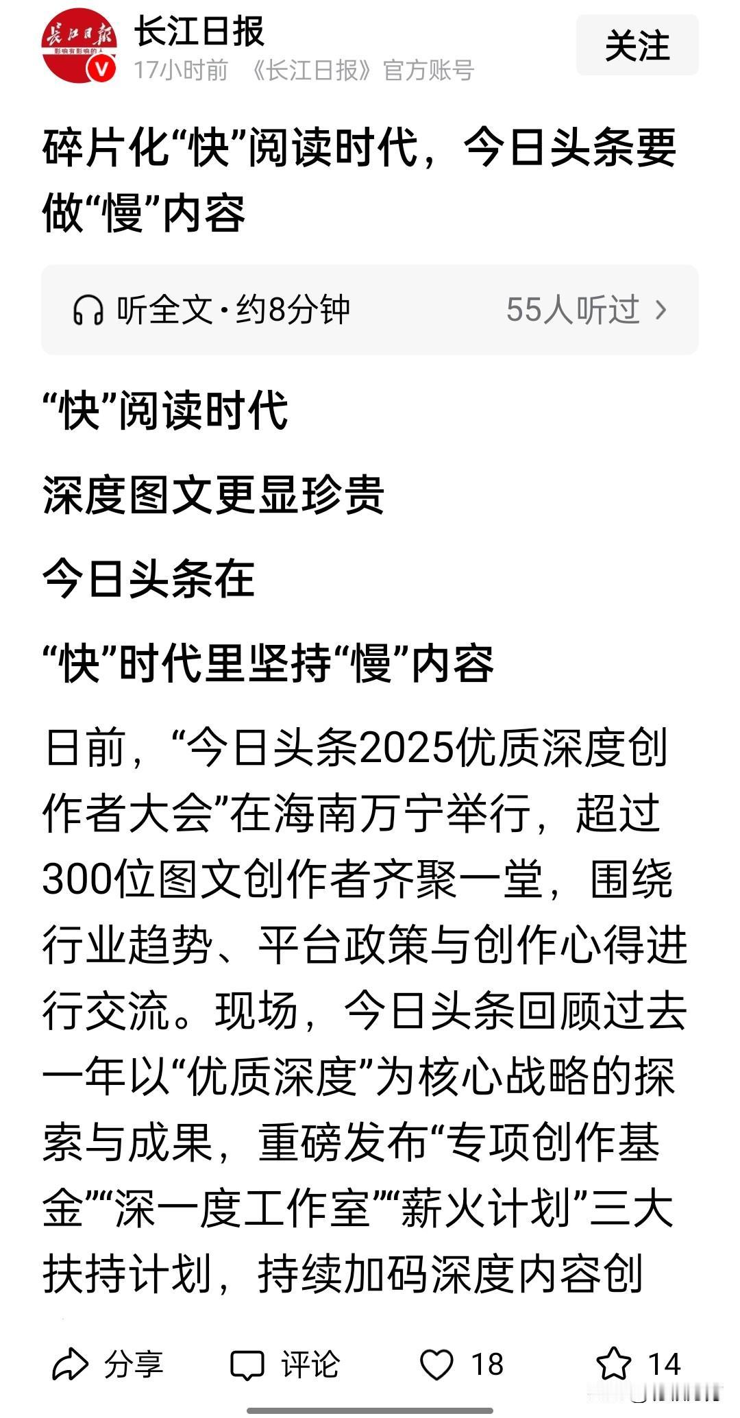 今日头条靠“快”起步,现在却要做“慢”内容,是好的转向。 据我的判断,今日头条在国内社交平台里算是对创作者要求最低的一家,当然也是最为友好的。由此造就了头条系各个产品的日渐壮大,但也使得作品内容庞杂但平均质量不高,大浪涌起难免泥沙俱下,浮躁作品泛滥让一些优质作者大感不平而愤然离开。 但事情正在起变化,或许是出于管理者的压力,或许是已经度过了粗放发展的阶段,头条现在有意鼓励“慢内容”创作,是好的开始。忙中有错,慢则从容,慢才能保证精细、准确、稳重与平和,才能慢工出细活,才能条分缕析地把道理讲清楚。 往者不可谏,以往怎么做的其实不太重要,关键是以后怎么去做。选好了方向,那就去努力,慢下来,对大家都有益无害。[握手]