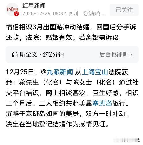 上海,小情侣蔡先生和陈女士在社交平台相识,三个月就热恋到谈婚论嫁,相约去美属塞班岛旅游时冲动结婚。回国后因异地分居,性格差异暴露,矛盾升级后分手。分手后陈女士起诉蔡先生,索要戒指折价款、机票和住宿费共5万余元,蔡先生则要求认定婚姻有效且拒不退款。法院介入后,仅用一招就让陈女士撤诉。 (来源:红星新闻) 蔡先生和陈女士,原本只是网络世界里的两个陌生人,因为一次偶然的社交互动,月老的红线就把他们紧紧地拴在了一起。 三个月的时间,对很多人来说,可能只是刚刚了解彼此的阶段,可他们却已经爱得死去活来,甚至决定携手走进婚姻的殿堂。 他们相约去美属塞班岛旅游,在那片美丽的海岛上,他们被浪漫的氛围冲昏了头脑,冲动地登记结婚了。 当时他们觉得,这就是爱情最美好的样子,不需要太多的了解和考虑,只要相爱就足够了。 可回国后,现实的问题就像一盆冷水,狠狠地浇灭了他们心中的热情。因为工作的原因,他们不得不异地分居。 距离产生的不是美,而是越来越多的矛盾和争吵。他们开始发现,彼此的性格差异竟然如此之大,那些曾经被爱情掩盖的问题,现在都一一暴露了出来。 异地分居的时候,两个人不能经常见面,沟通也可能会不及时,很容易产生误会和矛盾。而且,当一方遇到困难的时候,另一方不能及时给予陪伴和支持,感情就容易变淡。 最终,这段冲动的婚姻还是走到了尽头,他们选择了分手。 分手后,陈女士越想越觉得不甘心。她觉得,自己在这段感情里付出了那么多,旅行的时候花了机票钱和住宿费,结婚的时候还买了戒指,现在分手了,蔡先生应该把这些钱还给她。 于是,她一纸诉状把蔡先生告上了法庭,索要戒指折价款、机票和住宿费共5万余元。 蔡先生接到传票后,觉得特别委屈。自己在这段感情里也付出了很多,而且他拿出了自己的消费记录,证明自己花销比陈女士还大。 他不仅不同意还钱,还要求法院认定他们的婚姻是有效的,拒绝退款。 蔡先生要求认定婚姻有效,这在法律上有依据吗? 从法律上来说,他们在美属塞班岛登记结婚,只要婚姻登记证件真实有效,符合当地的法律规定,那他们的婚姻就是合法有效的。不过,这和他们之间的财产纠纷是两码事。 法院审理发现,二人在塞班岛的婚姻登记证件真实有效,确实符合当地的法律规定,他们的婚姻是合法有效的。 虽然他们现在分手了,但是他们的婚姻关系还是存在的。如果她想要解决财产纠纷的问题,必须先办理离婚手续。只有离婚后,才能根据具体情况来处理财产分割的问题。 陈女士这才恍然大悟,她原来以为,只要分手了,就可以直接索要自己付出的钱财,没想到还有这么多的法律程序要走。她开始反思自己的行为,觉得自己确实有些冲动了。 陈女士起诉索要这些费用,在法律上能得到支持吗? 陈女士以婚约财产纠纷起诉,可二人婚姻合法有效,机票住宿费属于他们恋爱期间的日常消费,戒指也不符合彩礼返还的情形。 所以,从法律上来说,她索要这些费用的请求很难得到支持。 经过一番思考后,陈女士决定主动撤诉。她觉得,既然婚姻还存在,自己再纠缠这些财产问题也没有意义了。 她打算先和蔡先生办理离婚手续,然后再根据实际情况来协商财产分割的问题。 蔡先生看到陈女士撤诉后,也松了一口气。他觉得,这件事情终于可以画上一个句号了。 他也反思了自己在这段感情中的问题,觉得自己太冲动了,没有好好地了解对方就轻易地走进了婚姻的殿堂。 婚姻是一件非常严肃的事情,不能因为一时的冲动和浪漫就盲目地做出决定。 在恋爱的时候,我们要多花时间去了解彼此,看看彼此的性格、价值观和生活习惯是否合适。 只有经过充分的了解和考虑,才能做出正确的选择。 在面对感情问题的时候,不能仅凭自己的感觉和想法去处理,要遵守法律的规定。 就像陈女士一样,如果她事先了解了一些关于婚姻和财产分割的法律知识,就不会做出这么冲动的行为,也不会给自己带来这么多的麻烦。 您对这件事有什么看法呢? 你觉得在恋爱和婚姻中,我们应该如何避免类似的冲动行为呢? 欢迎大家在评论区留言讨论,分享自己的看法和经验。