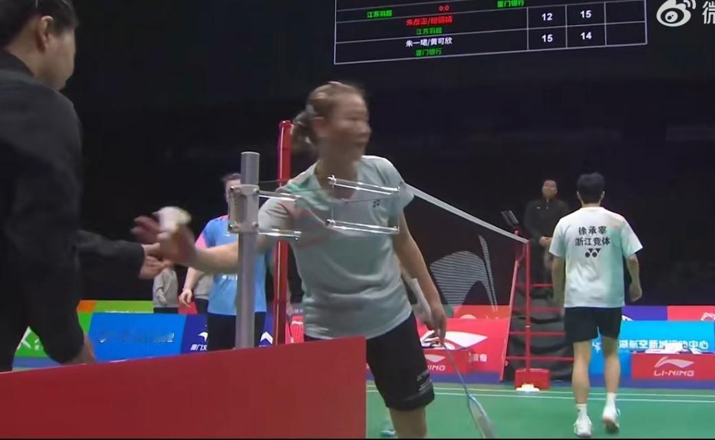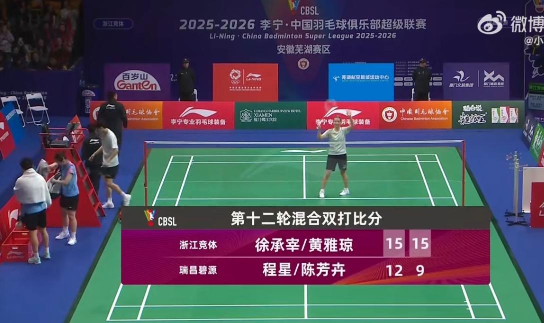 徐承宰/黄雅琼获首胜 今天中午,羽超联赛安徽芜湖站第二天的比赛开始。浙江竞体对阵瑞昌碧源的首场比赛中,浙江竞体的徐承宰/黄雅琼2-0击败瑞昌的程星/陈芳卉,收获二人羽超联赛合作以来的首胜。 两人上一次搭档是在上一站,与辽宁极兔的比赛中,当时两人配合不够默契,被郭新娃/刘圣书击败。今天的对手程星/陈芳卉实力要差一些,徐承宰/黄雅琼很快占据了场上主动,并以15-12、15-9取得胜利。 有个小细节,比赛结束后,徐承宰在与副裁握手时,把球还给裁判,随后黄雅琼与副裁握手,又把那个球要了回来。回到场边,她把球递给徐承宰,示意他去跟观众互动。徐承宰也心领神会,拿着球向看台跑去,给球迷挥手致意,把球打向看台,算是对支持他们的球迷的一点小回馈。 今天的比赛,徐承宰不兼项,浙江男双由王昶搭档陈旭君,将在最后一场比赛中,对阵瑞昌的程星/吴蔚昇。 混双结束后,第二场男单比赛中,胡哲安2-1击败王正行,浙江竞体已经2-0领先。