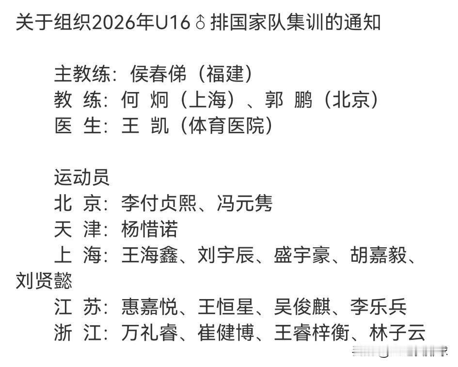 山东到底和中国排管有啥不可调和的矛盾? 随着2026年中国男女排U16名单官宣,具体请看图1和图2! 上海男女排入选球员最多,男排5个,女排4个。 女排主教练:袁志 男排主教练:侯春俤 男女排梯队培养最强莫过于上海、江苏和山东。可是在这两份名单上山东球员一个没有。 都说山东与排管有矛盾,我是不相信的。 毕竟今年女排各项都各入选了一名球员,像国家队王梦洁,U21李晨瑄,U19宋嘉逸…… 现在这名单又怎么说,不可能山东U16一个小苗子也没有,明年也没有全运会。 这波操作我又迷糊了!搞不懂!