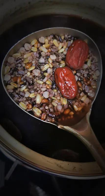 为什么自己煮的八宝粥没有饭店做的好吃。 今天才知道红豆是需要炒的,黑铁锅加上水加上八宝香粉,炒出古方八宝粥 黑红色,基豆加上大米,江米,麦仁,高粱米,葡萄干,大枣,花生,熬制。 今天做的八宝粥太好吃了。