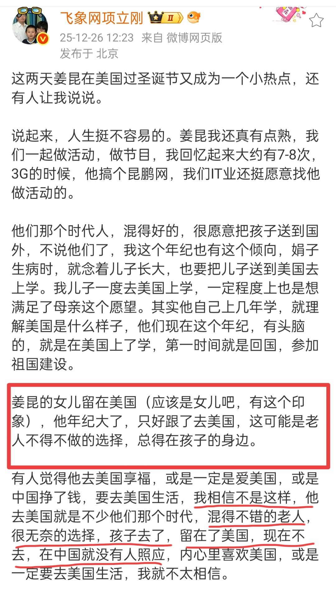 项立刚力挺相声名家姜昆。 近日,一段姜昆老师在彼岸聚会唱歌的视频在网上引起了热议。在这段视频中,姜昆老师手拿着手风琴弹奏,与一些老艺术家们合唱《我爱我的祖国》。 这段视频拍摄的时间还没有确定,有的人说是在今年的圣诞节前夕,而有的人说是其他的时间,地点确实是在大洋彼岸。 12月26日,项立刚先生发文,他说姜昆是那个时代混的好的人,当时愿意把孩子送到国外。项立刚解释说,姜昆老师现在年纪大了,在国内没人照应,所以不得不选择留在孩子的工作地。 项立刚又说他不太相信姜昆老师的内心喜欢彼岸。 姜昆一生追求高雅的相声,是国内著名的相声表演艺术家。这次因为一段歌唱视频陷入争议。目前,姜昆还没有发网络声明,具体情况还需要进一步了解。