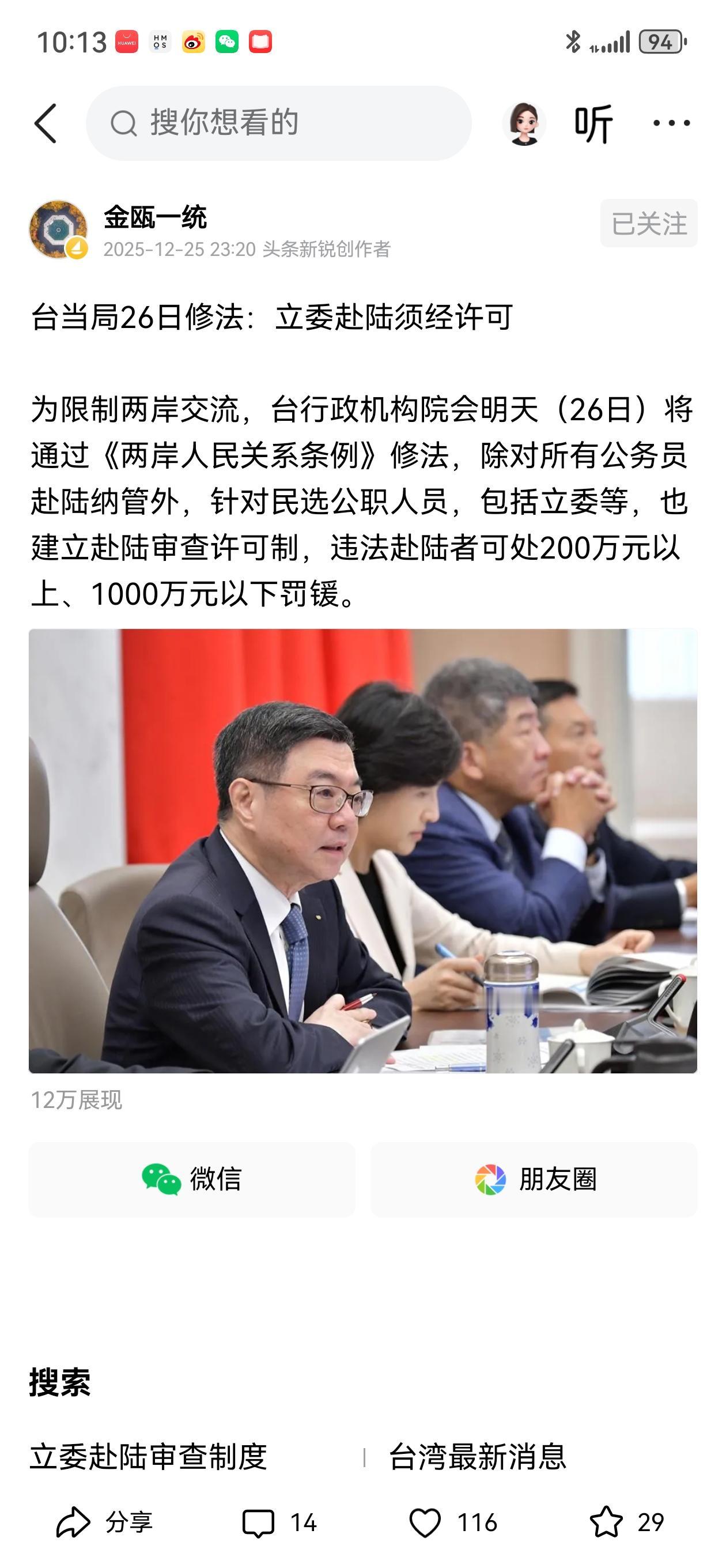 为限制两岸民众交流,台湾伪行政机构今天(12月26日)将对《两岸人民关系条例》修订,除对所有“公务员”纳入管理外,其他民选公职人民、民意代表等均纳入监管之内,未经批准赴大陆人员处200至1000万元新台币罚金。 《两岸人民关系条例》是两岸取得“九二共识”后,台湾当局依据所谓的《中华民国宪法》于1992年制定,对台湾地区、大陆地区的领土范围及民众作出清晰界定,其目的促进两岸民众交流、和平发展,保障两岸人民的合法利益。民进党当局上台后,不敢公开废止该条例,但多次利用行政手段对条例进行修订,阻挠两岸民众的正常交流,最终使该条例形同虚设。