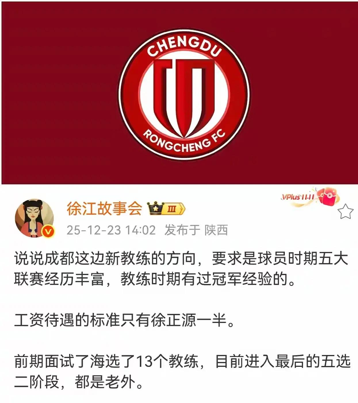 成都蓉城不装了下赛季剑指冠军!徐正源虽然是个好教练,但是他执教履历没有夺冠经历,蓉城挥泪斩马谡,然后在选主教练时一个硬性条件就是有执教夺冠经历,这个就已经很明显了,蓉城已经卸下伪装直指冠军而去。