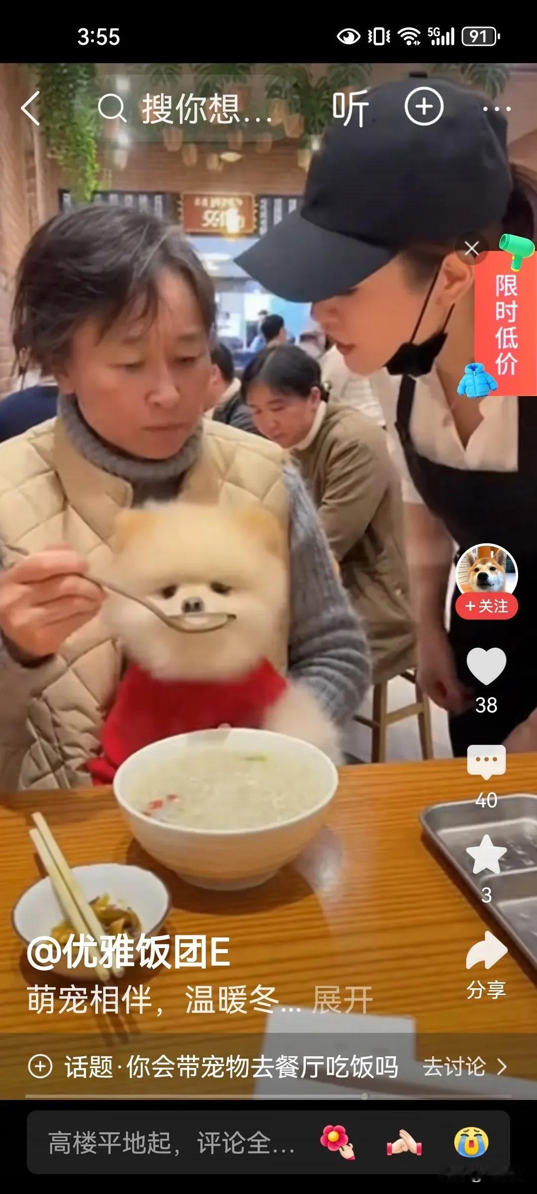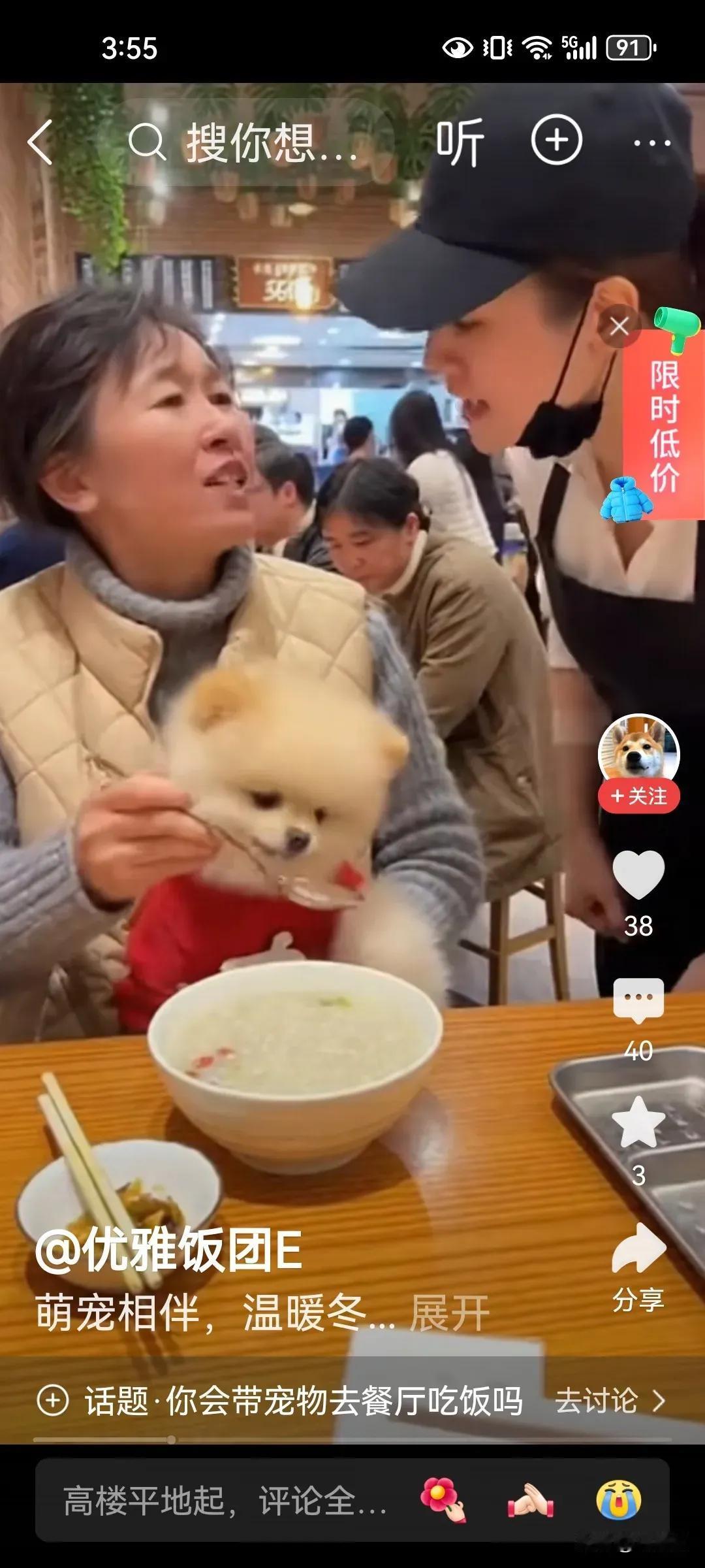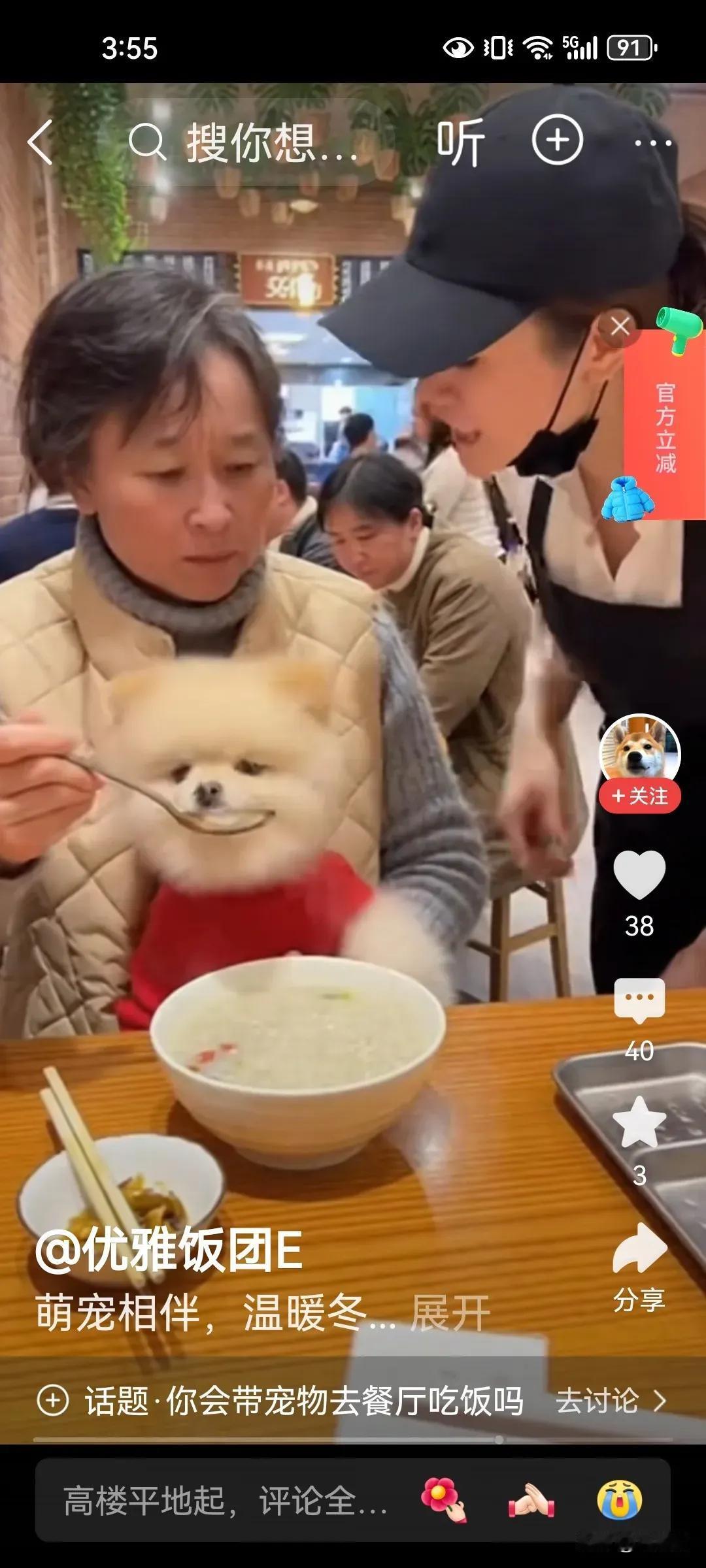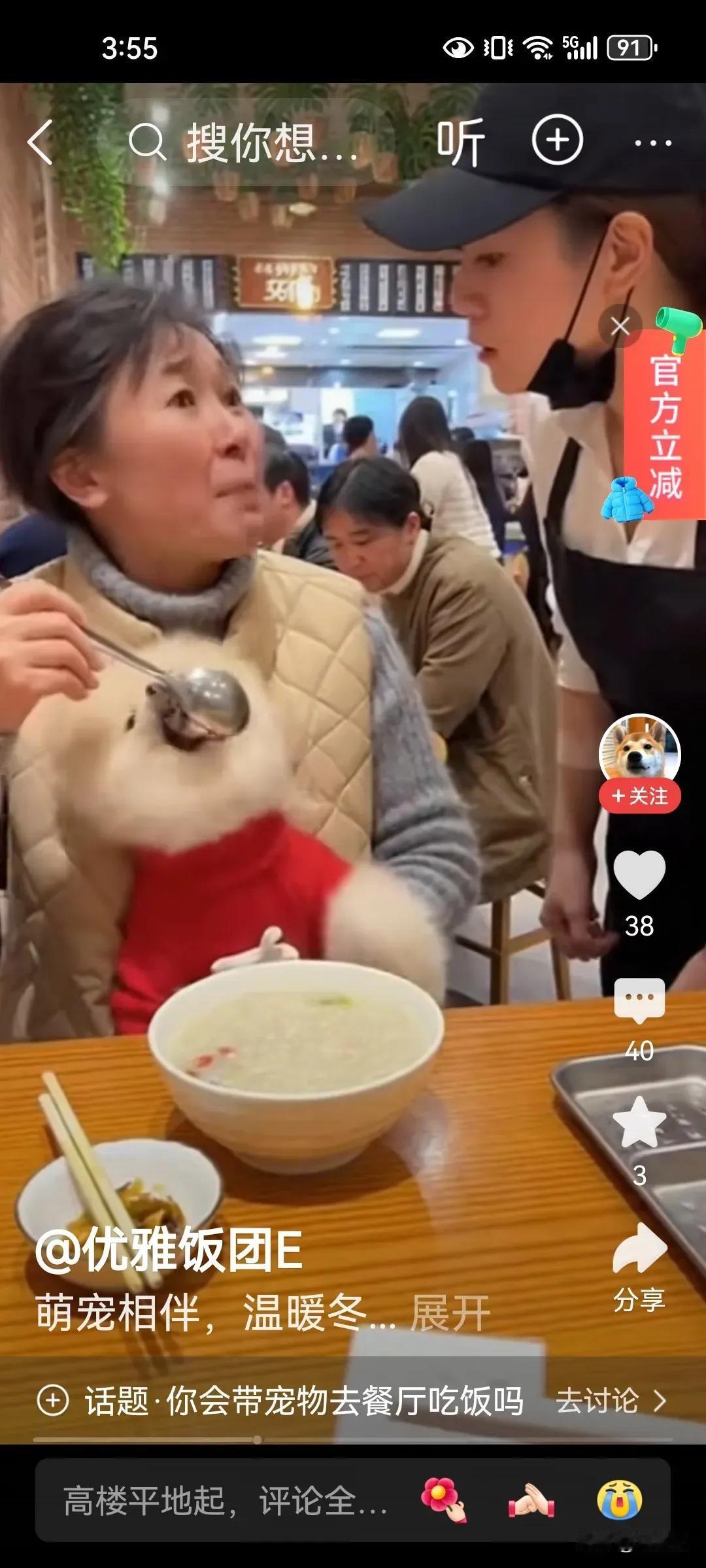 一个大妈在餐馆就餐,还带了一只宠物狗,最不可思议的是,竟然怀抱宠物狗,用饭馆的餐具喂狗,服务人员过来制止阻止,大妈还强词夺理振振有词,真的太震撼了。 有网友说: 1,只要是个人,都应该知道人与狗不能同用饭店的餐具 2,人畜共餐,成何体统,这是餐厅,不是你的家,在你的家你把它供起来都与任何人没关系。 晒图笔记大赛