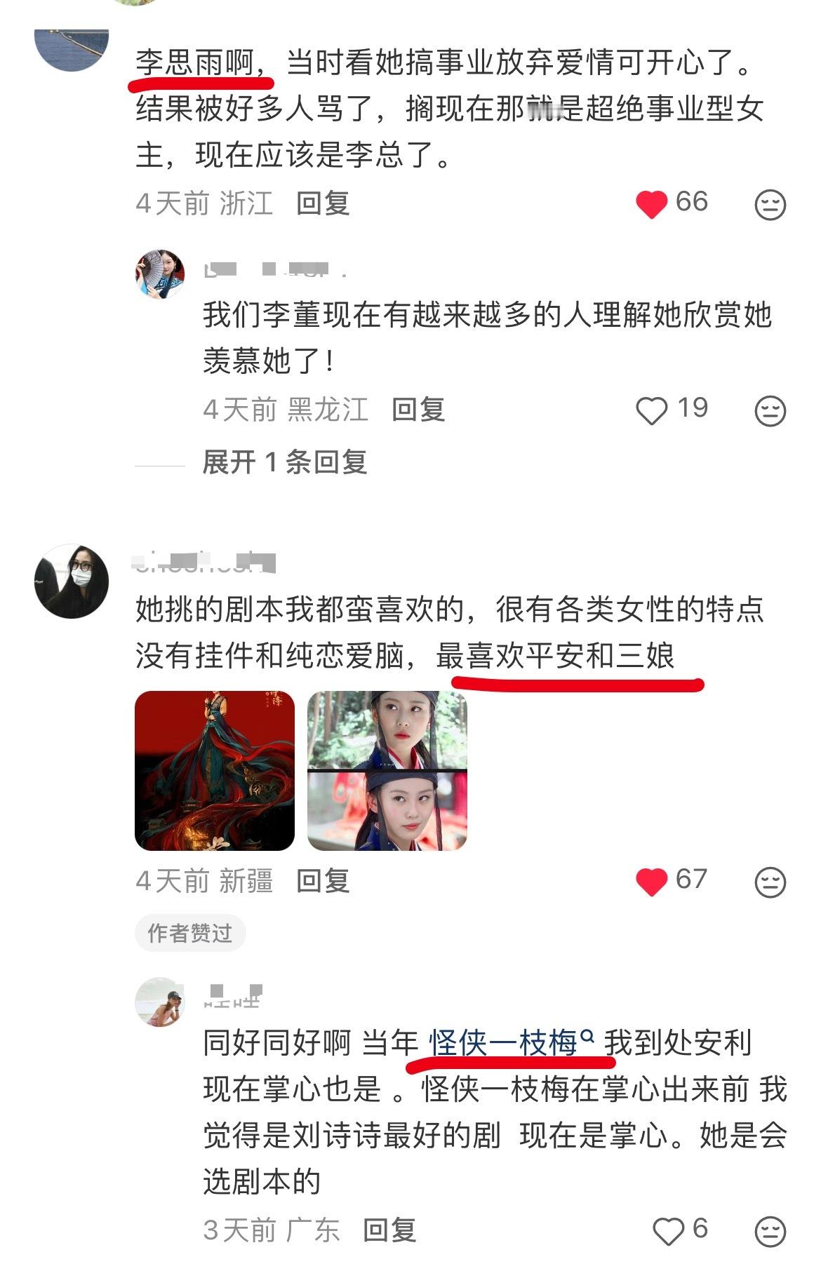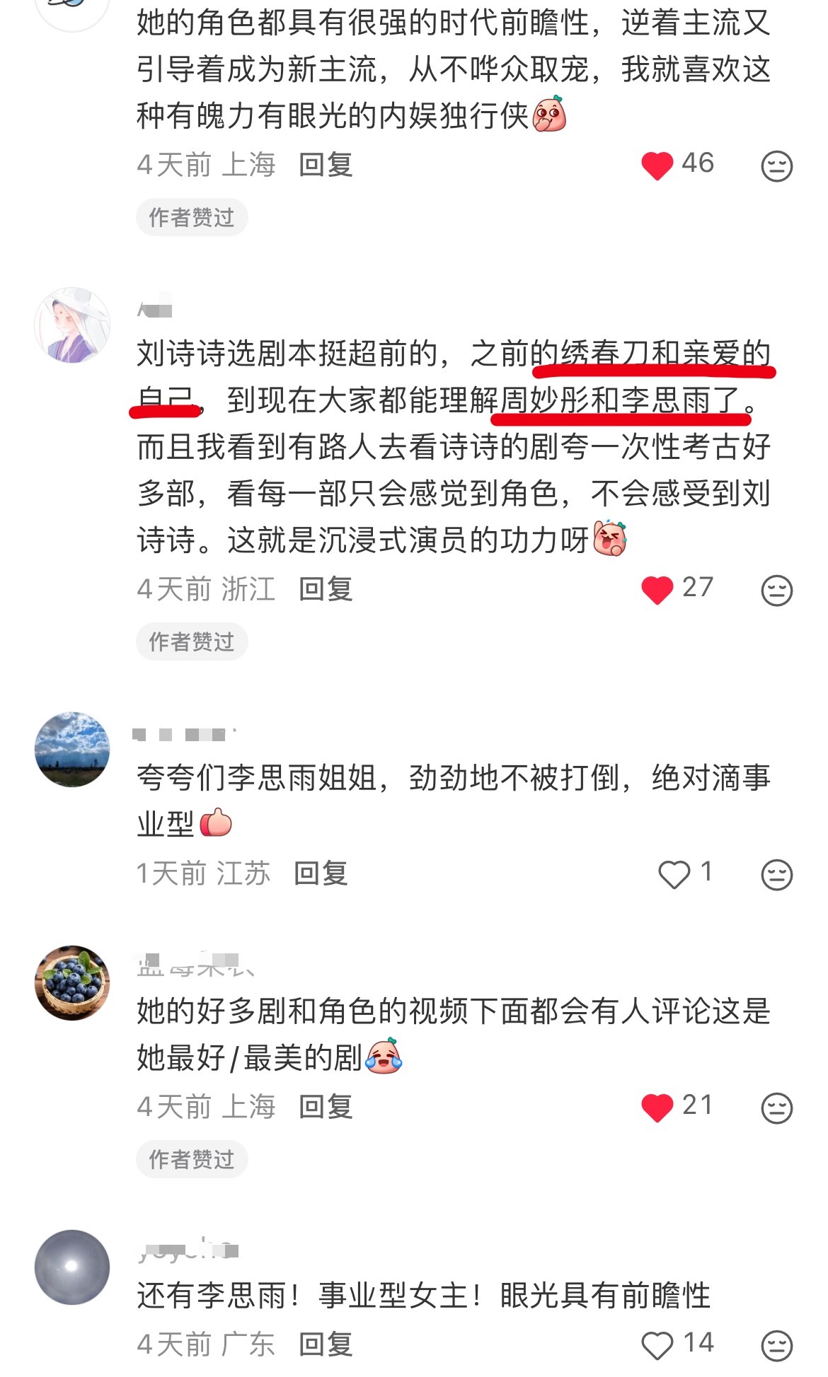 网友讨论刘诗诗剧和角色的超强时代前瞻性(蒋南孙,李思雨,叶平安等等),不追逐潮流,但引领潮流,也从不哗众取宠,佩服这种有魄力有眼光的内娱独行侠!也期待年代悬疑《醉梦》➕谍战《千里江山图》一姐带来的新角色