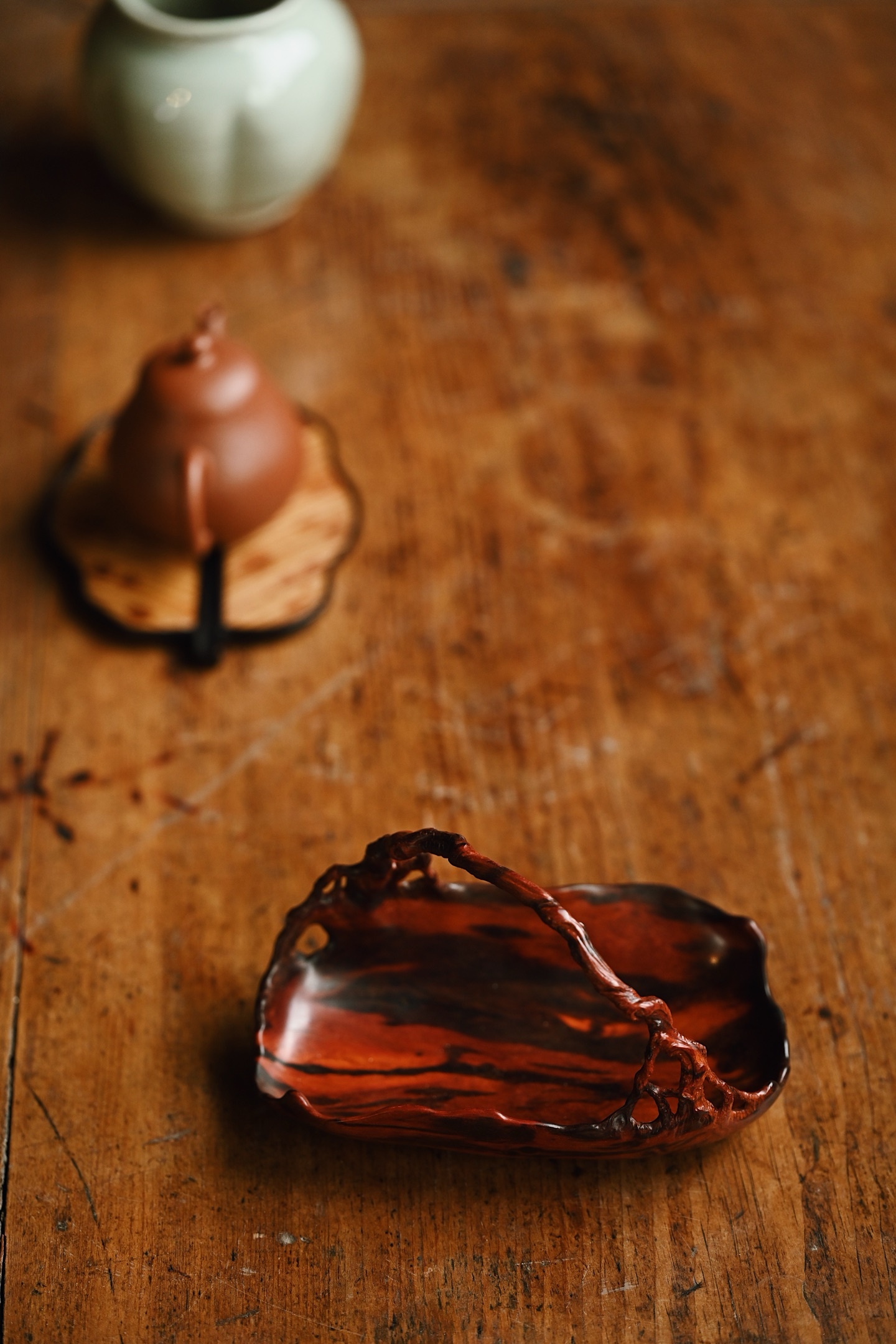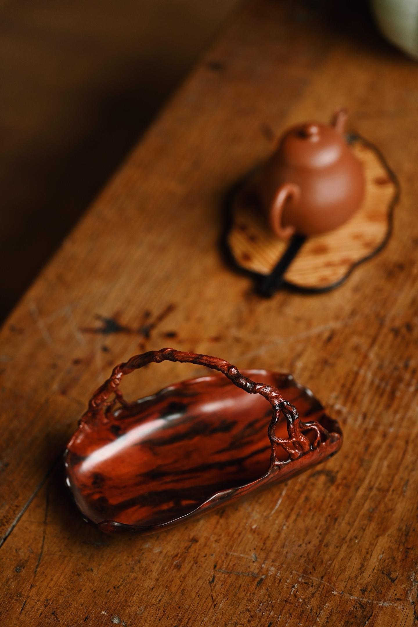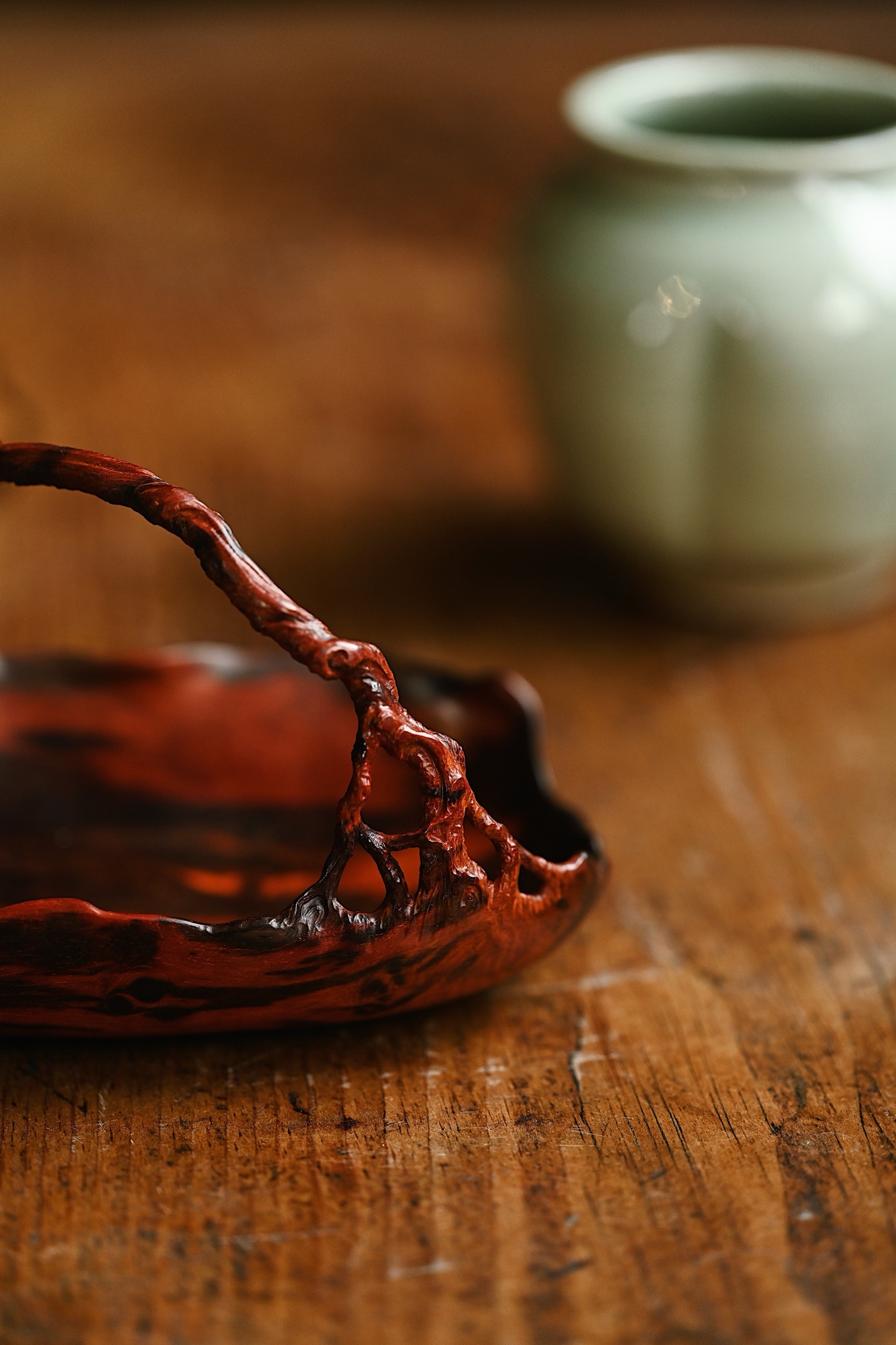 小叶紫檀 | 小果篮取料天然,巧思妙艺,随其料镂空雕刻盘根树节,盛瓜果静赏美景,空间内更显风雅之韵。15*9*9cm 88g